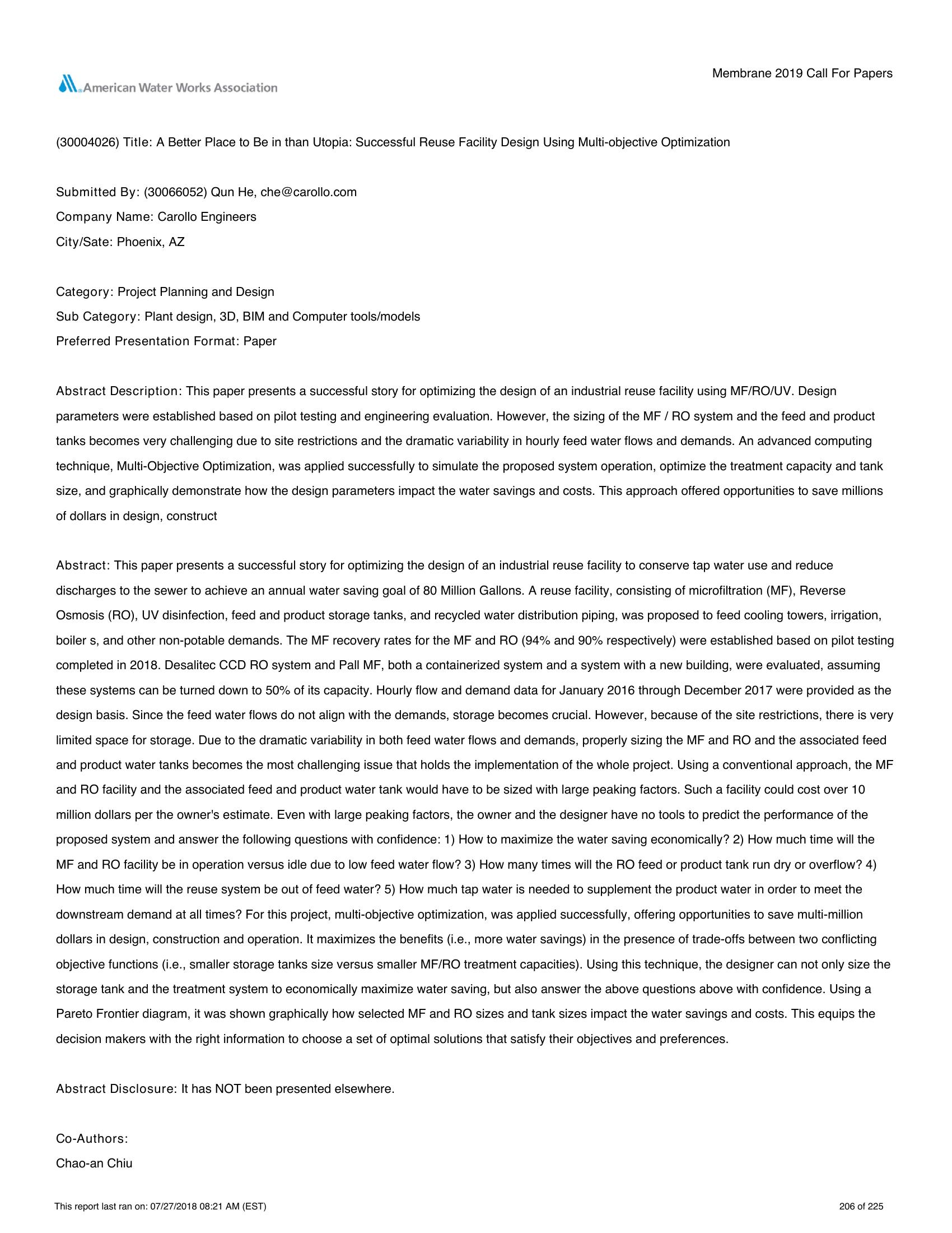 This paper presents a successful story for optimizing the design of an industrial reuse facility using MF/RO/UV. Design parameters were established based on pilot testing and engineering evaluation. However, the sizing of the MF / RO system and the feed and product tanks becomes very challenging due to site restrictions and the dramatic variability in hourly feed water flows and demands. An advanced computing technique, Multi-Objective Optimization, was applied successfully to simulate the proposed system operation, optimize the treatment capacity and tank