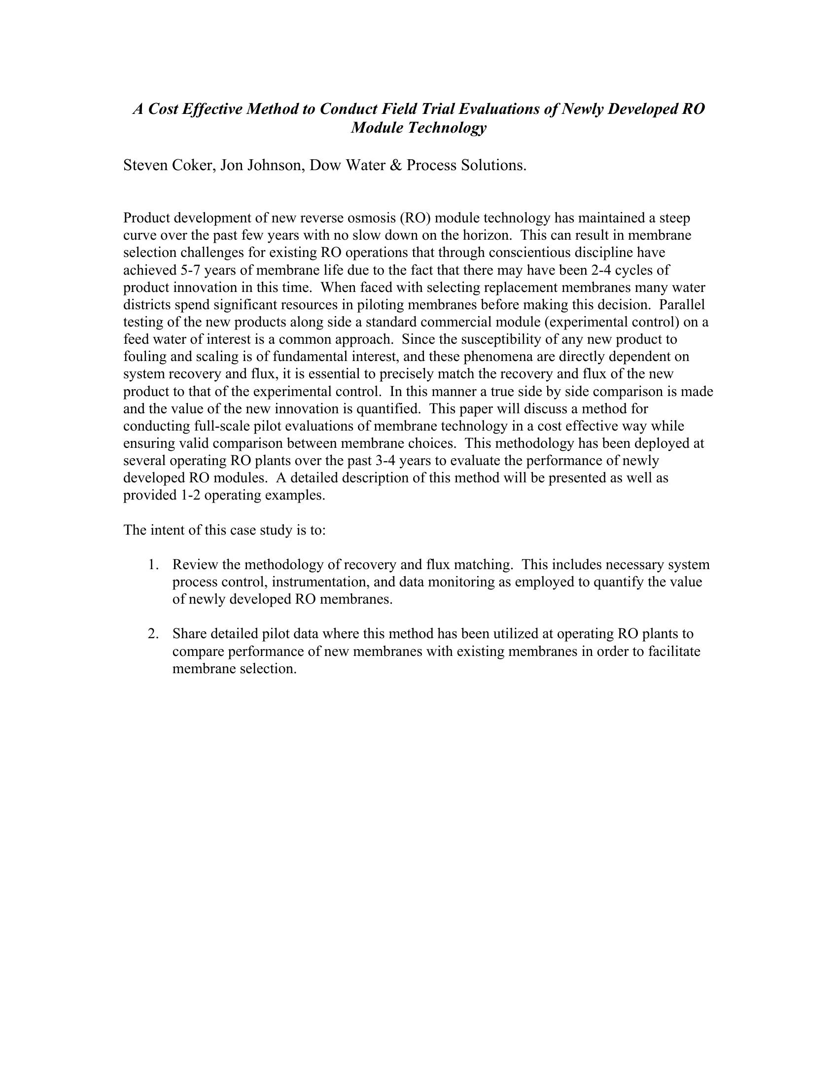 A Cost Effective Method to Conduct Field Trial Evaluations of Newly Developed RO Module Technology