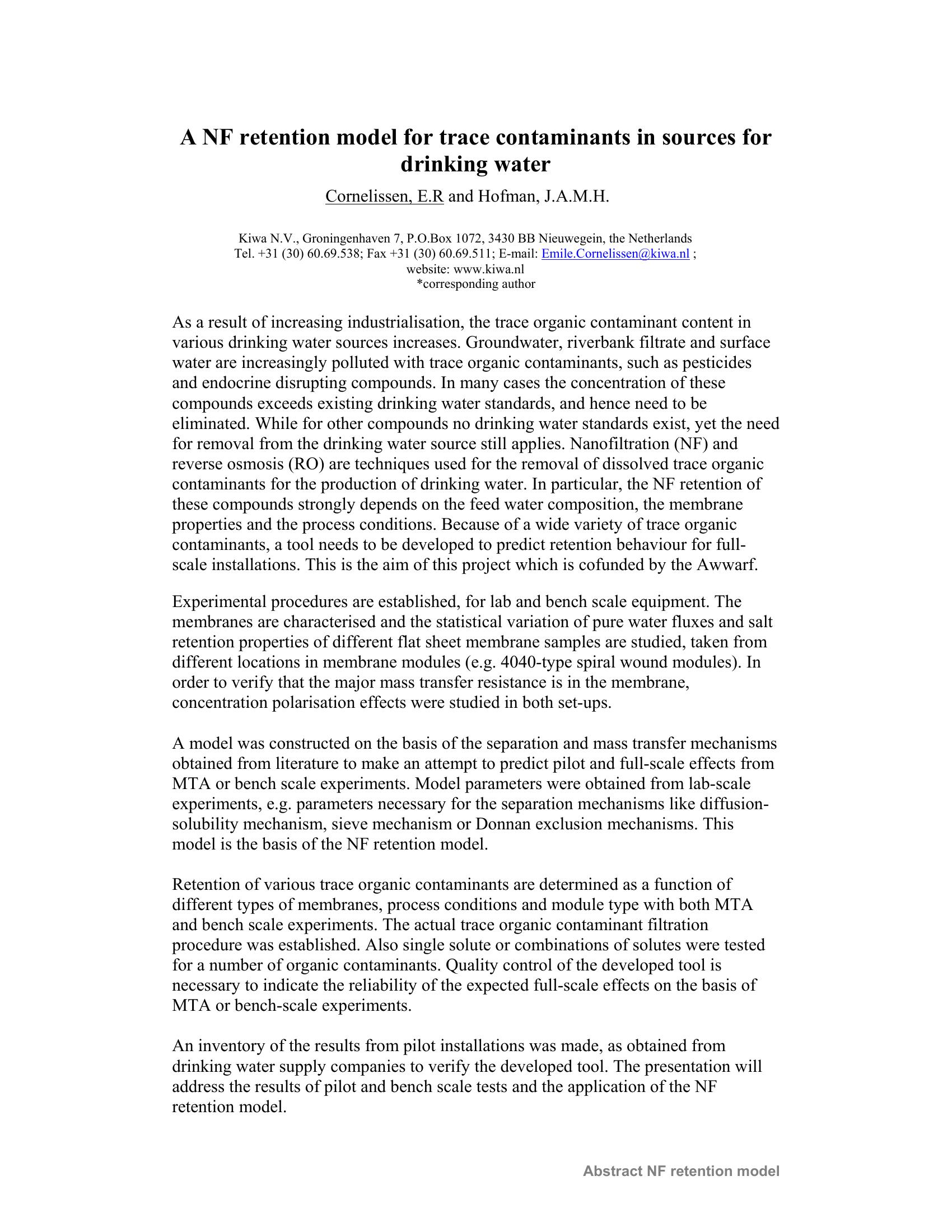 A NF Retention Model for Trace Contaminants in Sources for Drinking Water