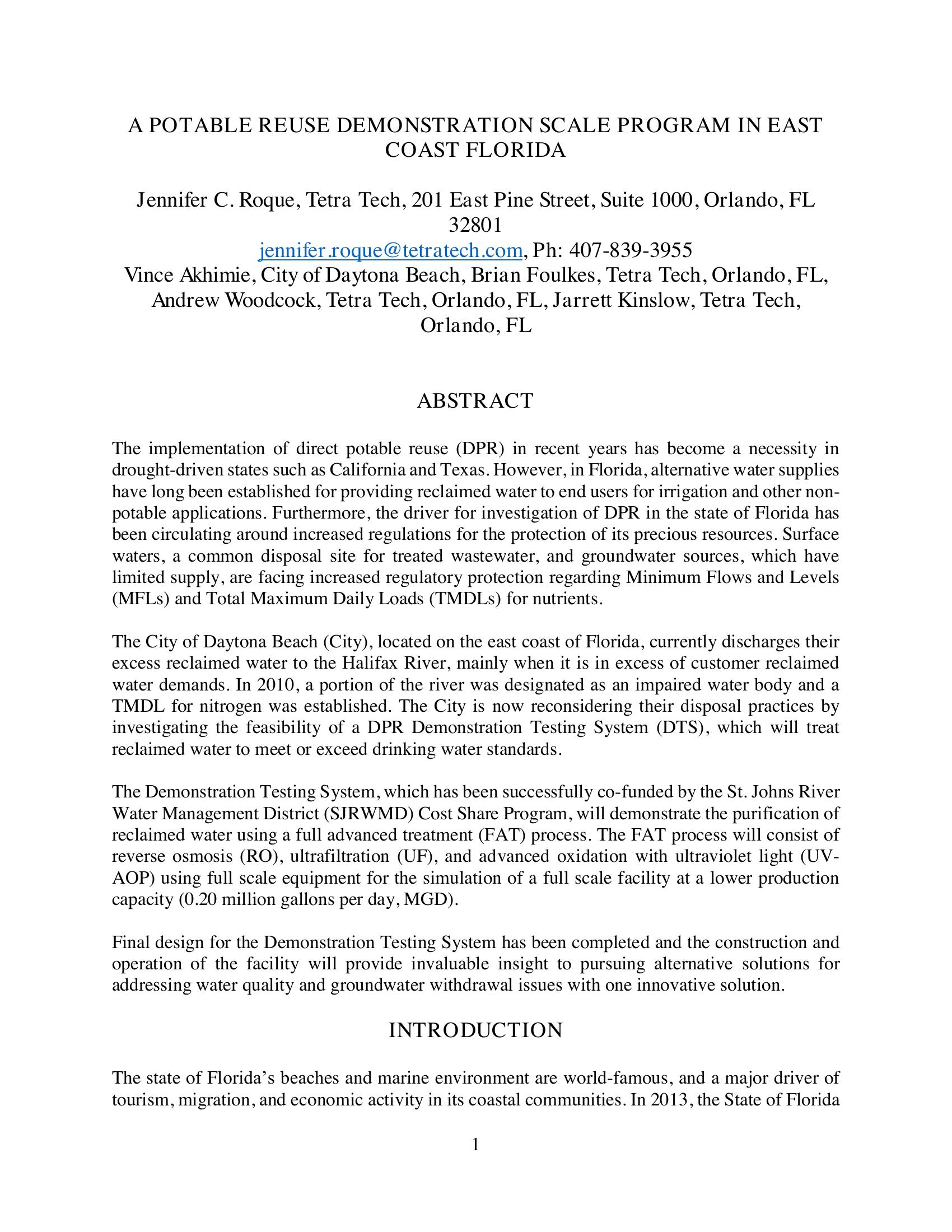 The implementation of direct potable reuse (DPR) in recent years has become a necessity in drought-driven states such as California and Texas. However, in Florida, alternative water supplies have long been established for providing reclaimed water to end users for irrigation and other non-potable applications. Furthermore, the driver for investigation of DPR in the state of Florida has been circulating around increased regulations for the protection of its precious resources. Surface waters, a common disposal site for treated wastewater, and groundwater sources, which have limited supply, are facing increased regulatory protection regarding Minimum Flows and Levels (MFLs) and Total Maximum Daily Loads (TMDLs) for nutrients. The City of Daytona Beach (City), located on the east coast of Florida, currently discharges their excess reclaimed water to the Halifax River, mainly when it is in excess of customer reclaimed water demands. In 2010, a portion of the river was designated as an impaired water body and a TMDL for nitrogen was established. The City is now reconsidering their disposal practices by investigating the feasibility of a DPR Demonstration Testing System (DTS), which will treat reclaimed water to meet or exceed drinking water standards. The Demonstration Testing System, which has been successfully co-funded by the St. Johns River Water Management District (SJRWMD) Cost Share Program, will demonstrate the purification of reclaimed water using a full advanced treatment (FAT) process. The FAT process will consist of reverse osmosis (RO), ultrafiltration (UF), and advanced oxidation with ultraviolet light (UV-AOP) using full scale equipment for the simulation of a full scale facility at a lower production capacity (0.20 million gallons per day, MGD). Final design for the Demonstration Testing System has been completed and the construction and operation of the facility will provide invaluable insight to pursuing alternative solutions for addressing water quality and groundwater withdrawal issues with one innovative solution.