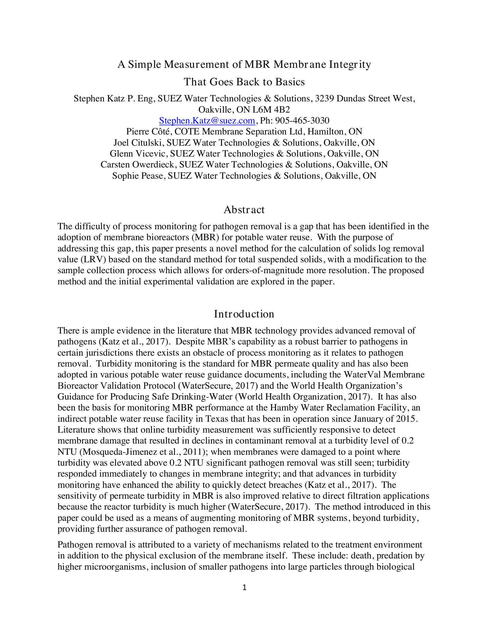 The difficulty in monitoring pathogen removal is a gap that has been identified in the adoption of Membrane Bioreactors for IPR/DPR. This paper presents a newly proposed method for the calculation of solids LRV across the MBR system. The new method relies on the widely used standard method for enumeration of total suspended solids with a modification to the sample collection process, which allows for orders-of-magnitude more resolution. This presentation will present the details of the proposed method, the empirical data, and the calculation method for solids LRV in an MBR application.