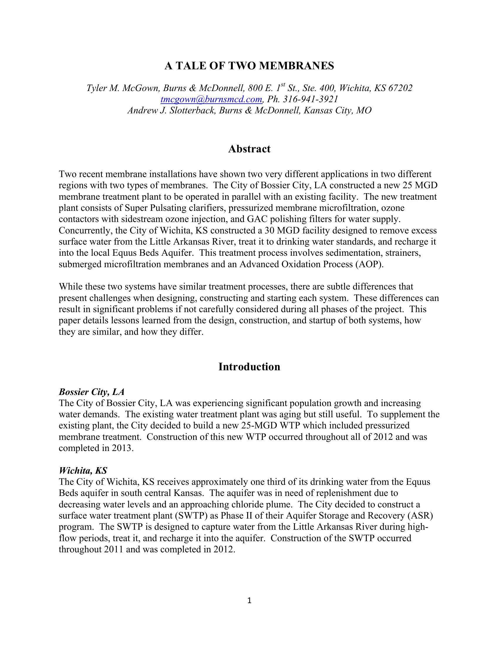 Two recent membrane installations have shown two very different applications in two different regions with two types of membranes. This paper details lessons learned from the design, construction, and startup of two membrane systems, how they are similar, and how they differ. One is in the City of Bossier City, LA a new 25 MGD microfiltration plant to be operated in parallel with an existing facility. The other was for the City of Wichita, KS, a 30 MGD facility designed to remove excess surface water from the Little Arkansas River, treat it to drinking water standards, and recharge it into the local Equus Beds Aquifer. This treatment process involves sedimentation, strainers, submerged microfiltration membranes and an Advanced Oxidation Process (AOP).