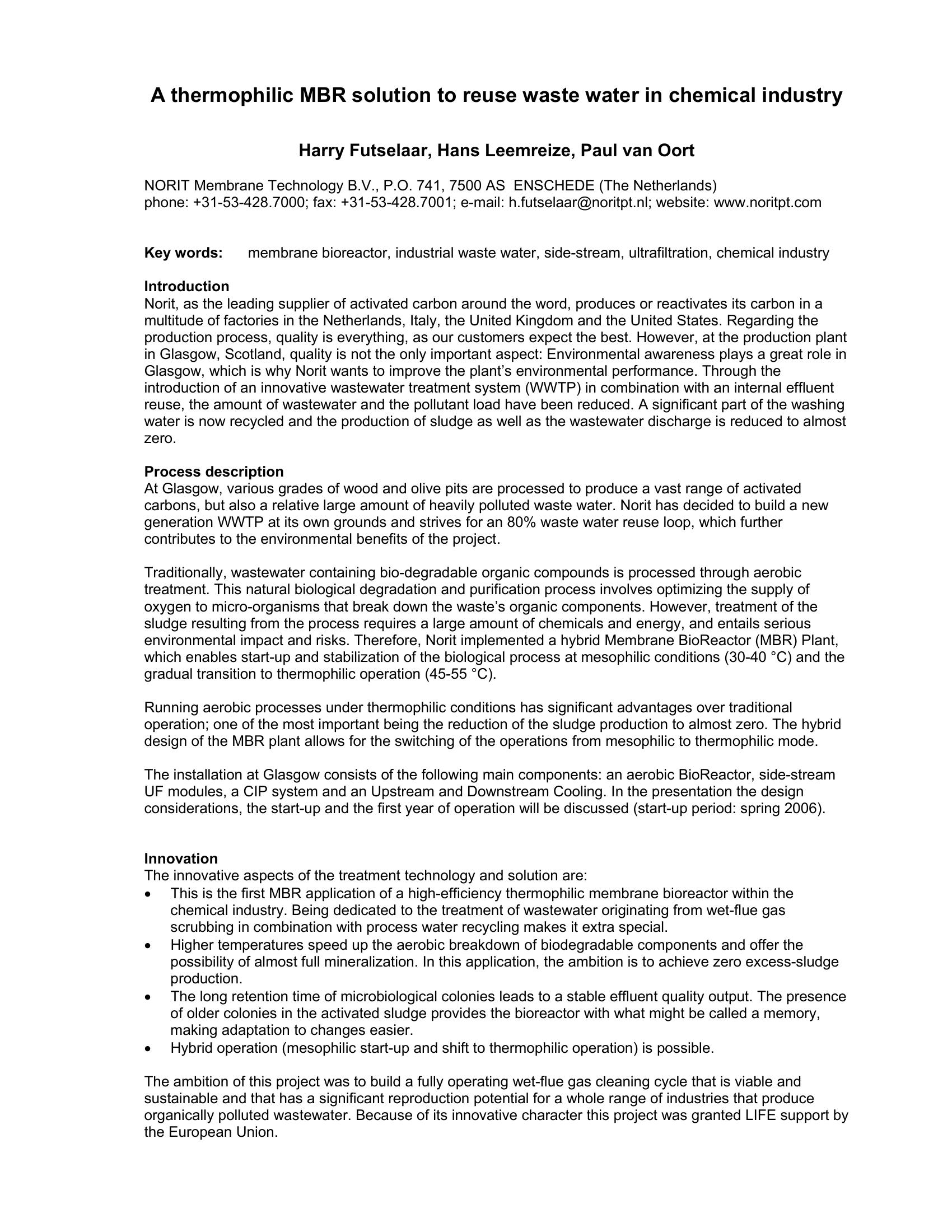 Keywordsthermophilic MBR, membrane bioreactor, industrial waste water, side-stream, ultrafiltration, chemical industry, Glasgow Scotland