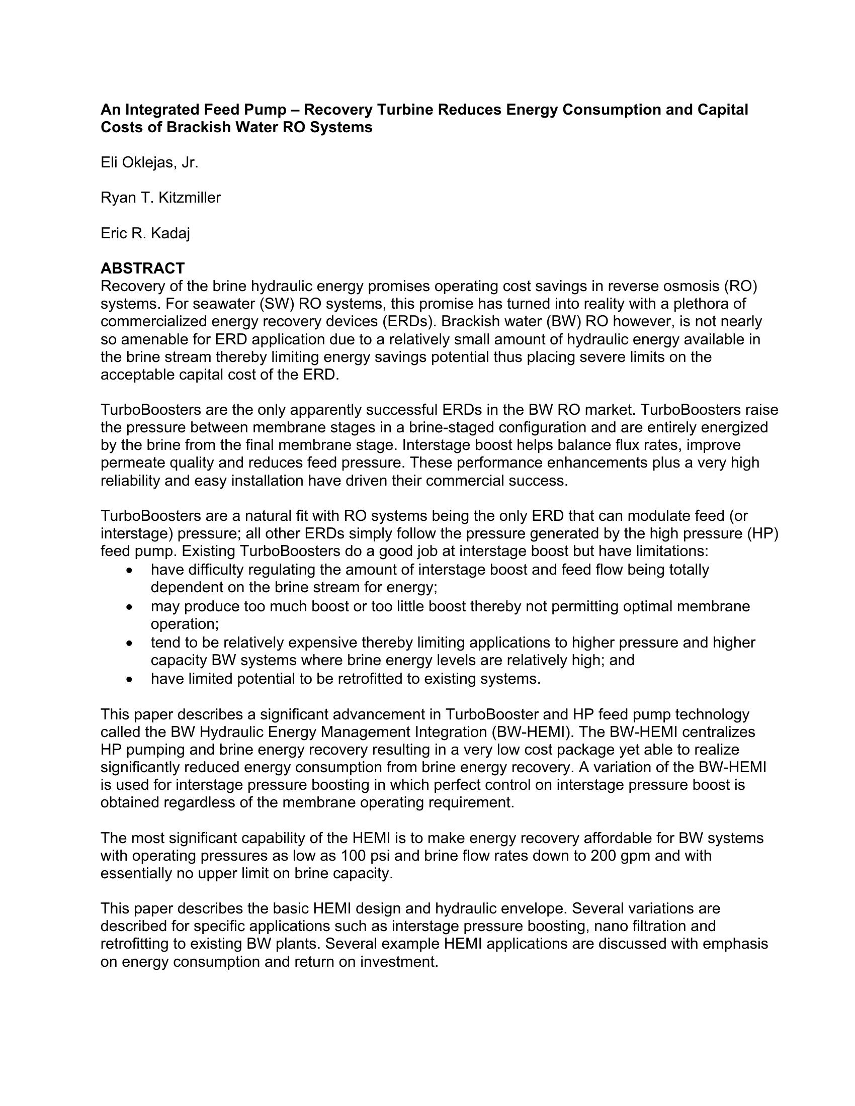 the brine stream thereby limiting energy savings potential thus placing severe limits on the acceptable capital cost of the ERD. TurboBoosters are the only apparently successful ERDs in the BW RO market. TurboBoosters raise the pressure between membrane stages in a brine-staged configuration and are entirely energized by the brine from the final membrane stage. Interstage boost helps balance flux rates, improve permeate quality and reduces feed pressure. These performance enhancements plus a very high reliability and easy installation have driven their commercial success. This paper describes a significant advancement in TurboBooster and HP feed pump technology called the BW Hydraulic Energy Management Integration (BW-HEMI). The BW-HEMI centralizes HP pumping and brine energy recovery resulting in a very low cost package yet able to realize significantly reduced energy consumption from brine energy recovery. A variation of the BW-HEMI is used for interstage pressure boosting in which perfect control on interstage pressure boost is obtained regardless of the membrane operating requirement.
