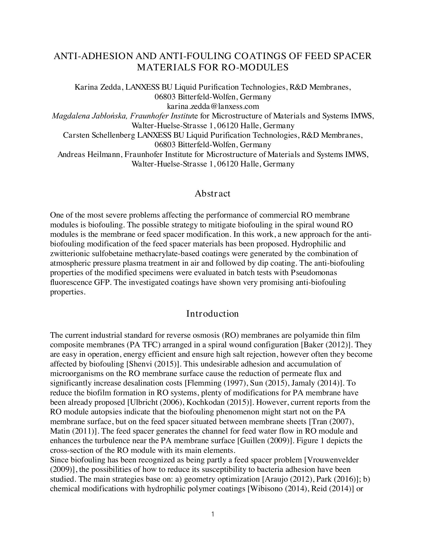 In this work, a new approach for the anti-biofouling modification of the feed spacer surface has been proposed. Hydrophilic and zwitterionic sulfobetaine methacrylate-based coatings were generated by the combination of atmospheric pressure plasma treatment in air and followed by dip coating. The anti-adhesion properties of the modified specimens were evaluated in batch tests with Pseudomonas fluorescence GFP via Gramnegative staining with subsequent UV-Vis spectrometry and observation using SEM. Long-term anti-biofouling test was performed over several days in a fouling simulator, where the pressure drop increase has been monitored. The investigated coatings have shown very promising anti-adhesion and antibiofouling properties.