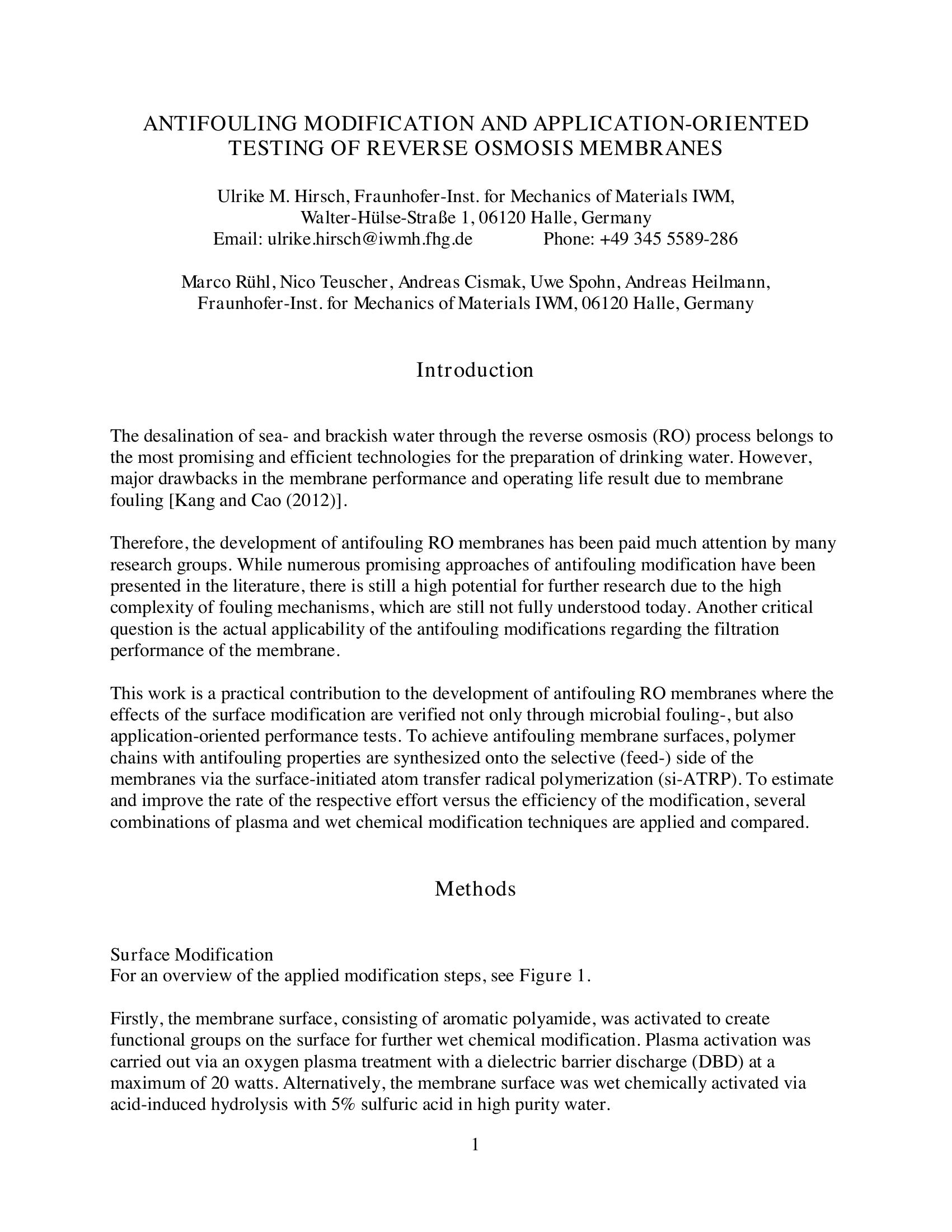 | Keywords | Antifouling, Reverse Osmosis, surface modification |