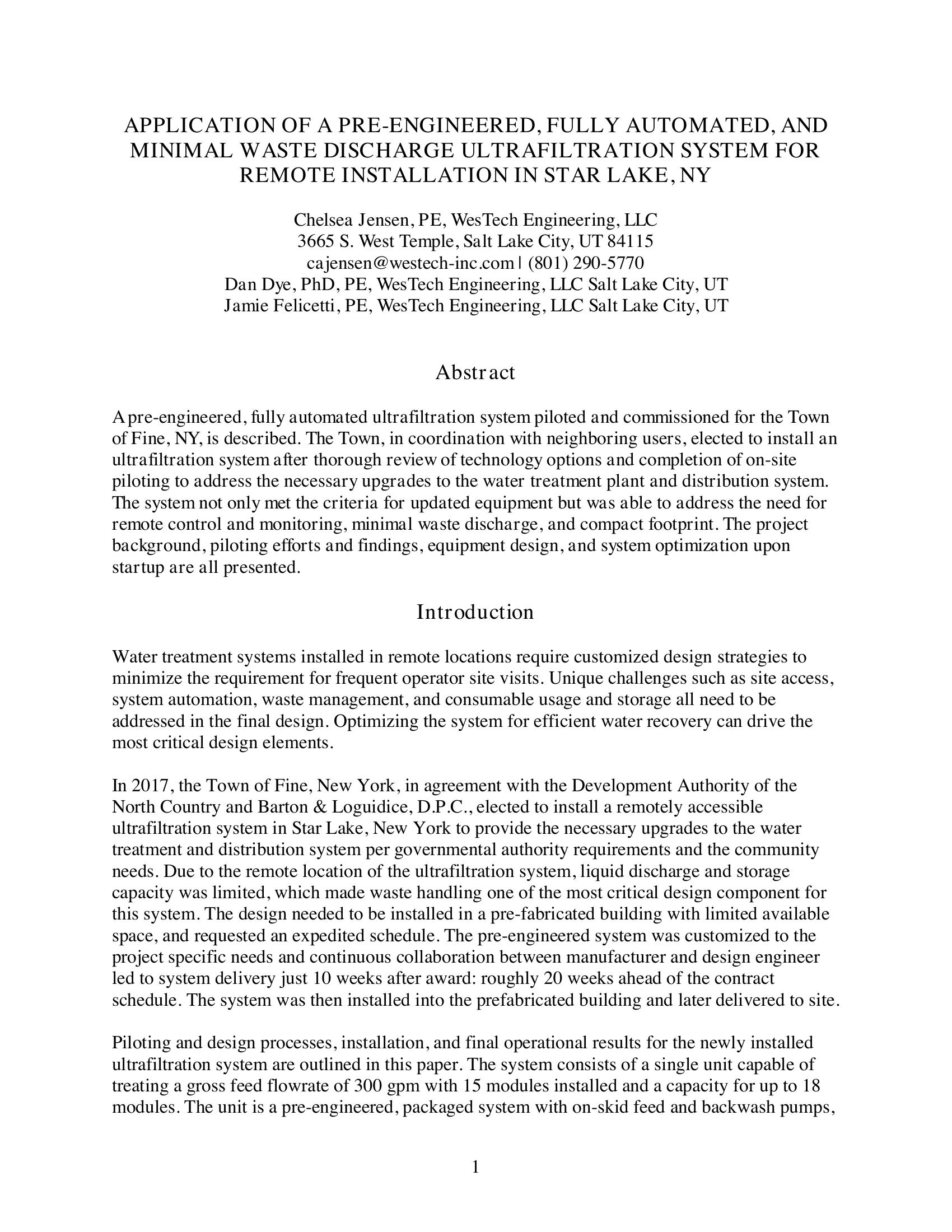 A pre-engineered, fully automated ultrafiltration system piloted and commissioned for the Town of Fine, NY, is described. The Town, in coordination with neighboring users, elected to install an ultrafiltration system after thorough review of technology options and completion of on-site piloting to address the necessary upgrades to the water treatment plant and distribution system. The system not only met the criteria for updated equipment but was able to address the need for remote control and monitoring, minimal waste discharge, and compact footprint. The project background, piloting efforts and findings, equipment design, and system optimization upon startup are all presented.