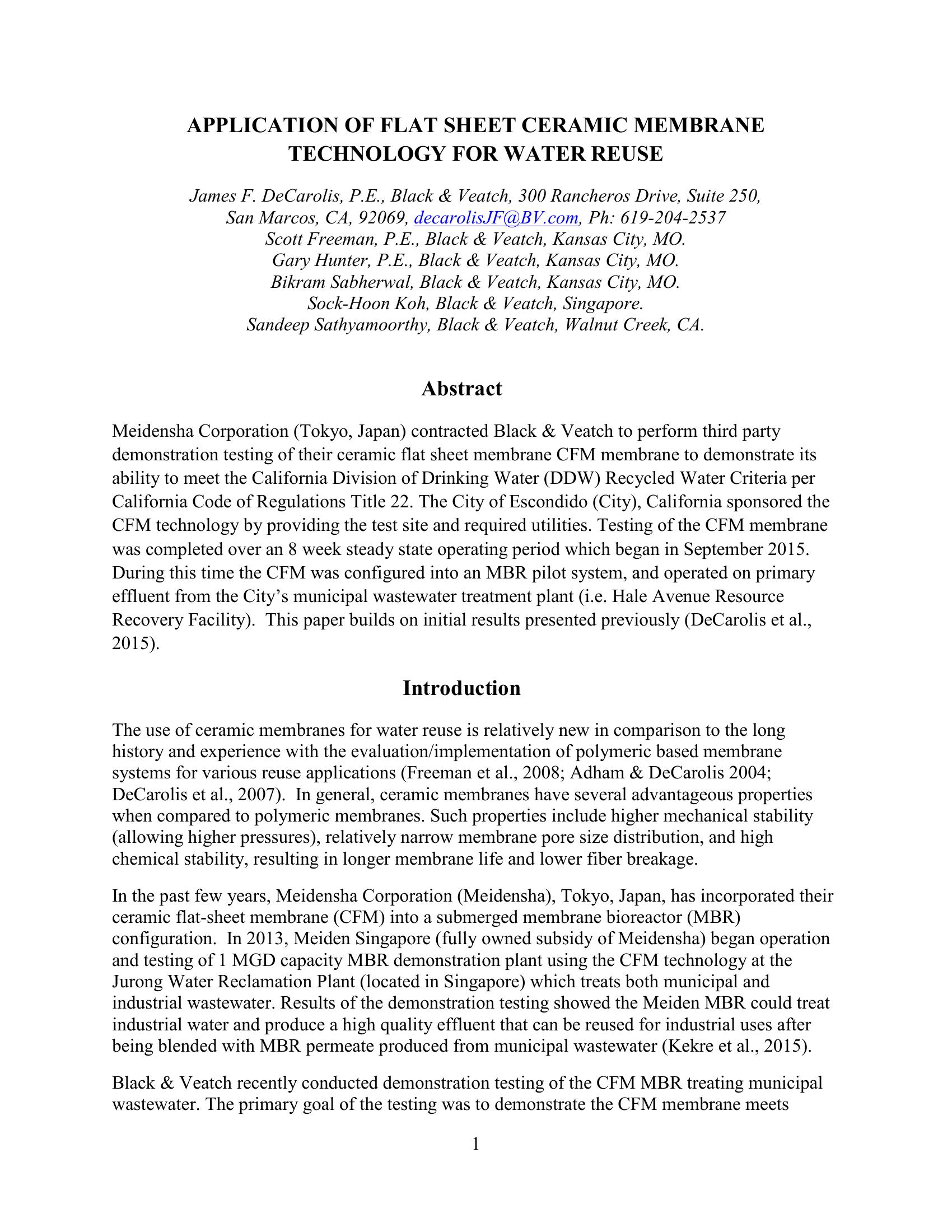Meidensha Corporation (Tokyo, Japan) contracted Black & Veatch to perform third party demonstration testing of their ceramic flat sheet membrane CFM membrane to demonstrate its ability to meet the California Division of Drinking Water (DDW) Recycled Water Criteria per California Code of Regulations Title 22. The City of Escondido (City), California sponsored the CFM technology by providing the test site and required utilities. Testing of the CFM membrane was completed over an 8 week steady state operating period which began in September 2015. During this time the CFM was configured into an MBR pilot system, and operated on primary effluent from the City’s municipal wastewater treatment plant (i.e. Hale Avenue Resource Recovery Facility). This paper builds on initial results presented previously (DeCarolis et al., 2015).