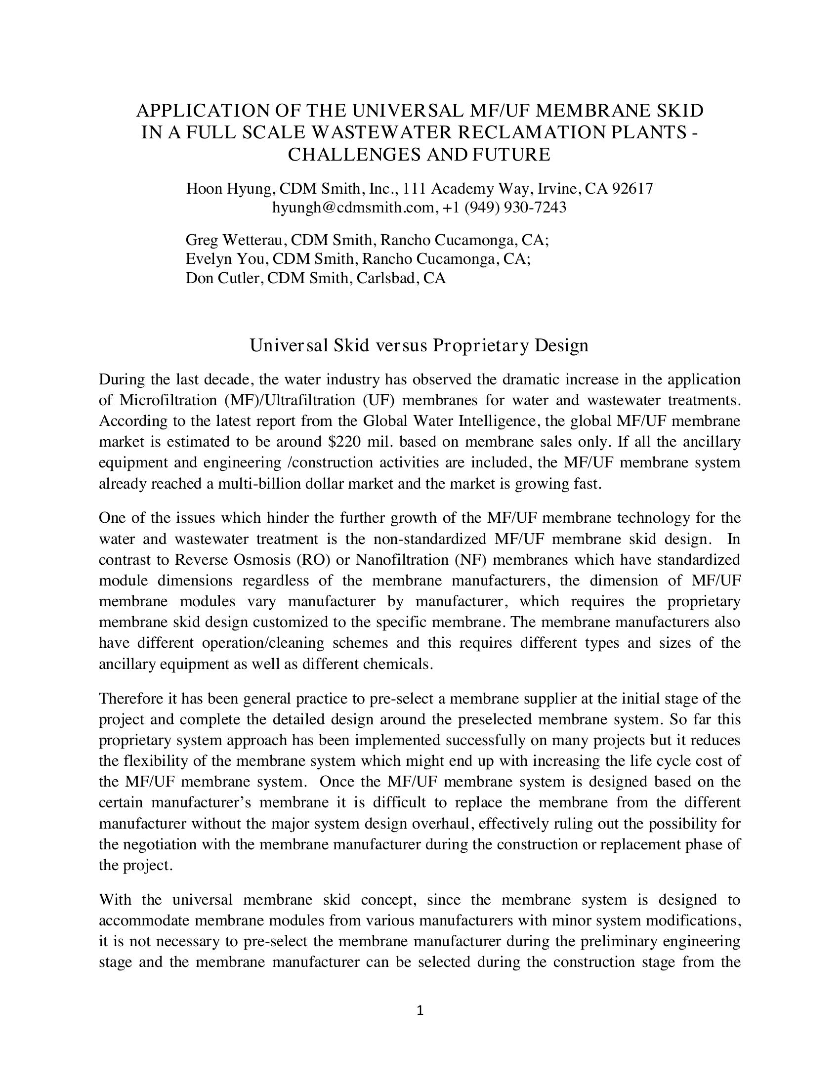 During the last decade, the water industry has observed the dramatic increase in the application of Microfiltration (MF)/Ultrafiltration (UF) membranes for water and wastewater treatments. According to the latest report from the Global Water Intelligence, the global MF/UF membrane market is estimated to be around $220 mil. based on membrane sales only. If all the ancillary equipment and engineering /construction activities are included, the MF/UF membrane system already reached a multi-billion dollar market and the market is growing fast. One of the issues which hinder the further growth of the MF/UF membrane technology for the water and wastewater treatment is the non-standardized MF/UF membrane skid design. A universal membrane skid concept, in which the membrane system is designed to accommodate membrane modules from various manufacturers with minor system modifications, it is not necessary to pre-select the membrane manufacturer during the preliminary engineering stage and the membrane manufacturer can be selected during the construction stage via competitive bidding.