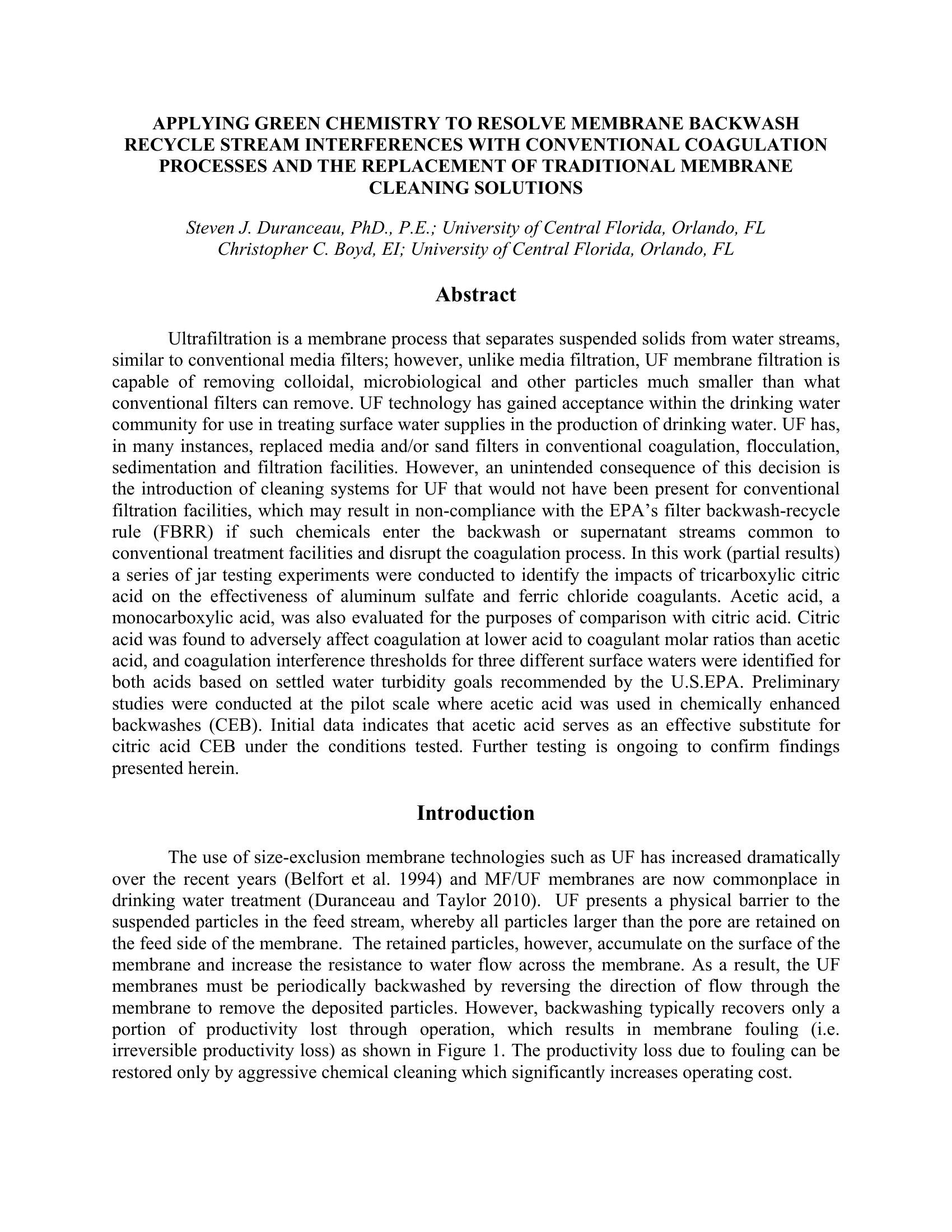 Applying Green Chemistry to Resolve Membrane Backwash Recycle Stream Interferences with Conventional Coagulation Processes and the Replacement of Traditional Membrane Cleaning Solutions