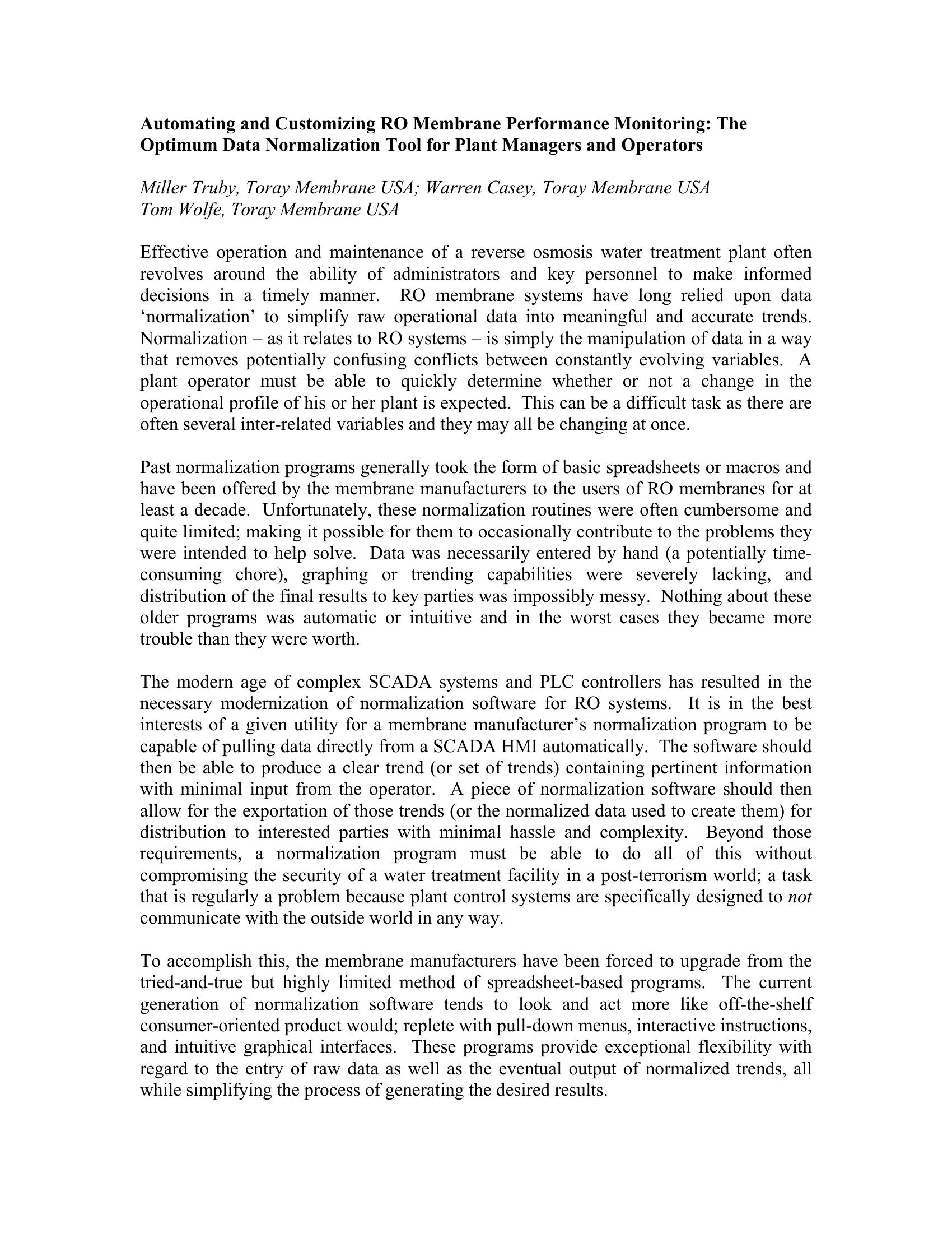 Automating and Customizing RO Membrane Performance Monitoring: The Optimum Data Normalization Tool for Plant Managers and Operators