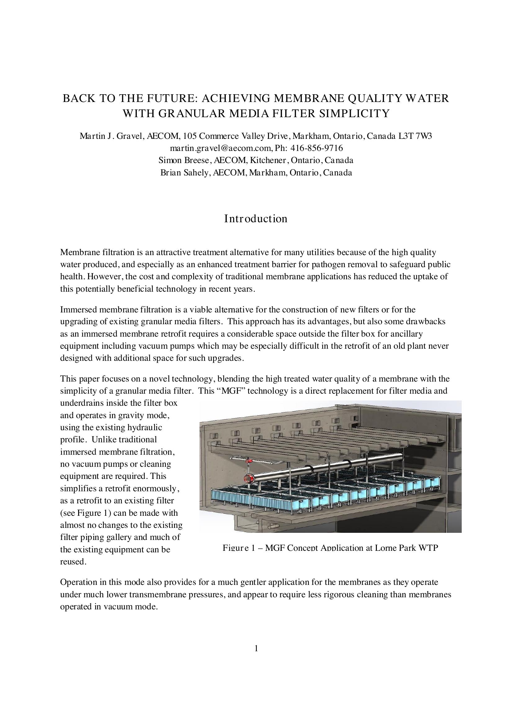 This paper focuses on a novel technology, blending the high-treated water quality of a membrane with the simplicity of a granular media filter. This ?MGF? technology is a direct replacement for filter media and underdrains inside the filter box and operates in gravity mode, using the existing hydraulic profile. Unlike immersed membrane filtration, no vacuum pumps or cleaning equipment are required. This simplifies a retrofit enormously, as a retrofit to an existing filter can be made with almost no changes to the existing filter piping gallery and much of the existing equipment can be reused. The abstract should be added to the program as it demonstrates innovation in advancing membranes through simplification.