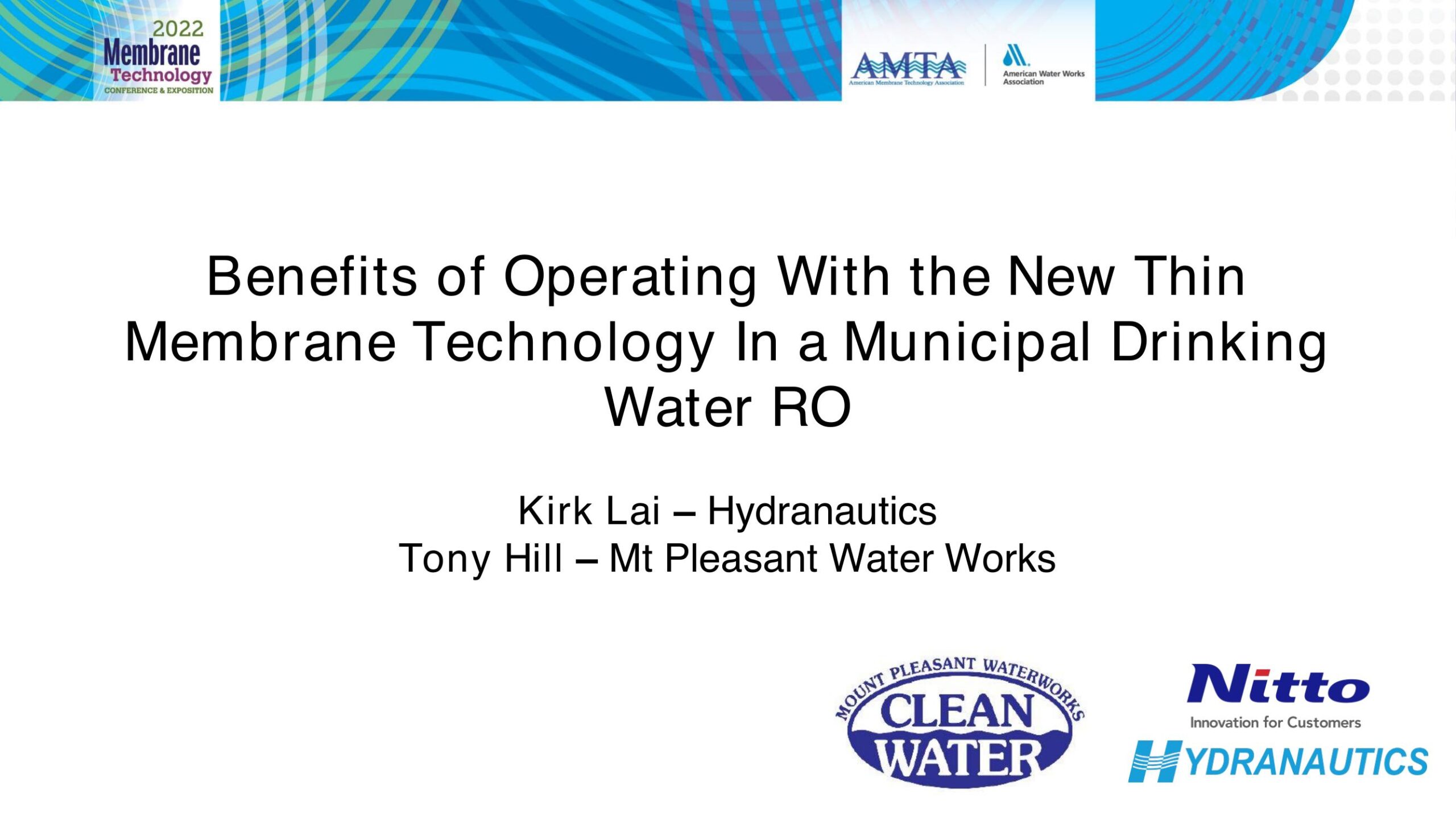 Mount Pleasant Waterworks (MPW) is currently operating the first municipal drinking water RO system using a new, thin membrane technology. The new technology increases the amount of active membrane area that can be manufactured in the standard spiral wound element. Mount Pleasant Water District is the first municipal district to replace conventional RO spirals with new spirals utilizing the new technology and demonstrate how an existing RO system can realize the benefits of this innovative membrane while avoiding costly design modifications. The spiral wound element was originally developed in the 1970s to package RO flat sheet membrane into a compact, efficient, and usable unit. Since its inception, incremental improvements in the spiral element design and materials of construction have led to enhanced efficiencies and productivity. However, the overall element design has remained largely unchanged. Most notably, in recent years, efforts to fit more material into the present spiral element configuration reached an optimal plateau. Advances in automated manufacturing resulted in either increasing the membrane surface area or increasing the thickness of the feed/brine spacer. Either enhancement could be selected depending on the quality of the feedwater or the efficiency of the pre-treatment. However, it was not possible for the system designer to capitalize on the benefits associated with both enhancements. For this reason, when treating high quality source water, system designers prefer to use spiral elements that contain higher surface area to realize lower capital cost or lower operating cost. But the higher area elements forfeit the benefits associated with a thicker feed/brine spacer which include reduced differential pressure losses, less fouling and improved cleaning effectiveness. In recent years, thanks to innovations in material science, a new generation of RO elements are now being manufactured. These new elements, now running in the Mount Pleasant RO, offer both a larger surface area and thicker feed/brine spacer. This paper will detail the innovation in the construction of the new membrane material and compare its design and performance to that of the conventional membrane. Based on the operation of these new elements at Mount Pleasant, the benefits of the new membrane will be compared to the previously installed conventional membranes. The comparison will include operating data to demonstrate a reduction in feed pressure, differential pressure, and energy consumption.