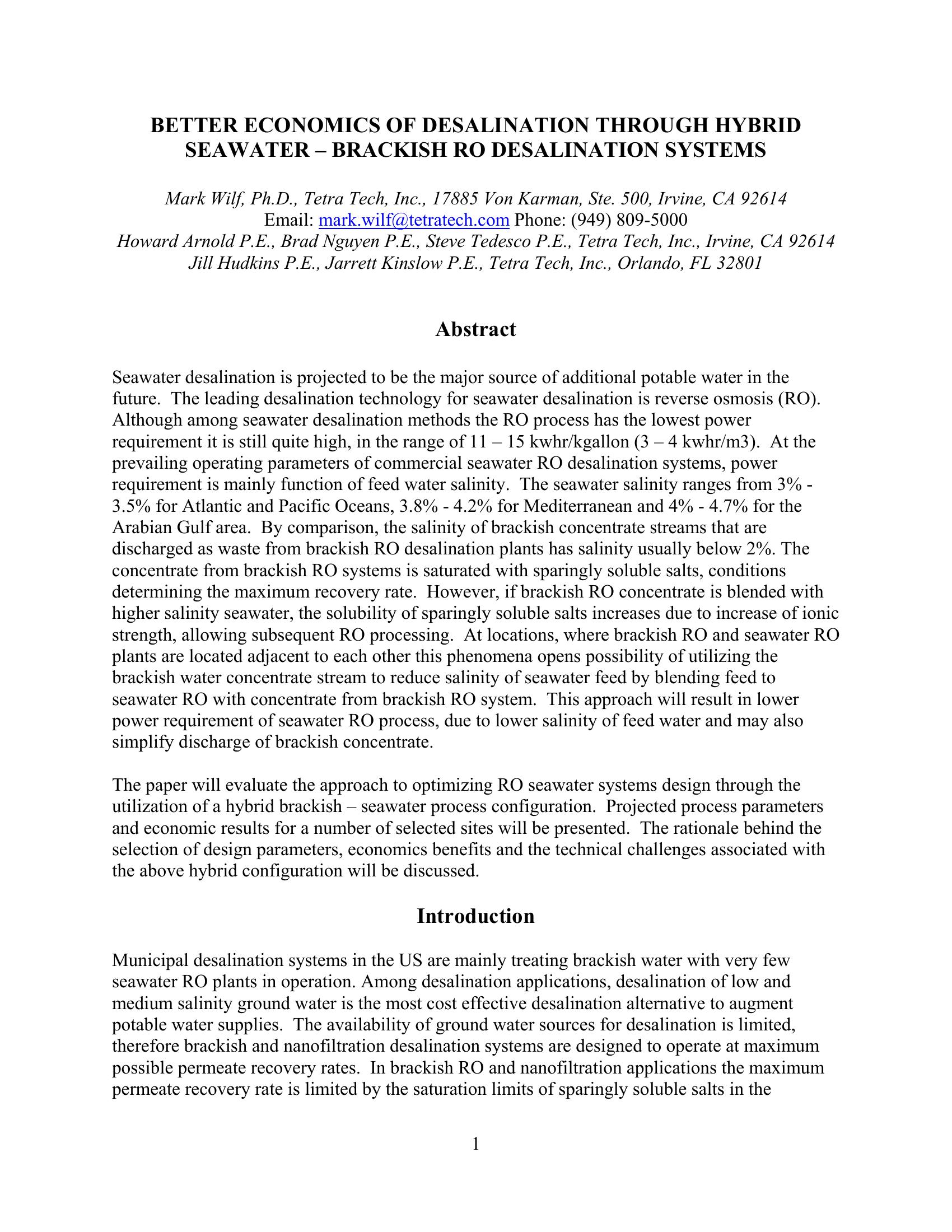 The paper will evaluate the approach to optimizing RO seawater systems design through the utilization of a hybrid brackish – seawater process configuration. Projected process parameters and economic results for a number of selected sites will be presented. The rationale behind the selection of design parameters, economics benefits and the technical challenges associated with the above hybrid configuration will be discussed.