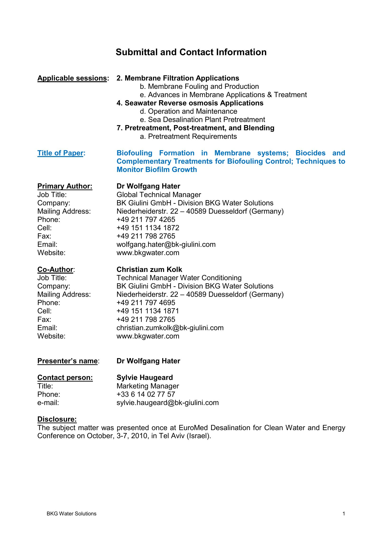 All raw waters contain microorganisms such as bacteria, fungi, virus, algae, which have the ability to reproduce and form a biofilm under favorable conditions, like on the surface of a reverse osmosis (RO) or nanofiltration (NF) membrane, where nutrients dissolved in the