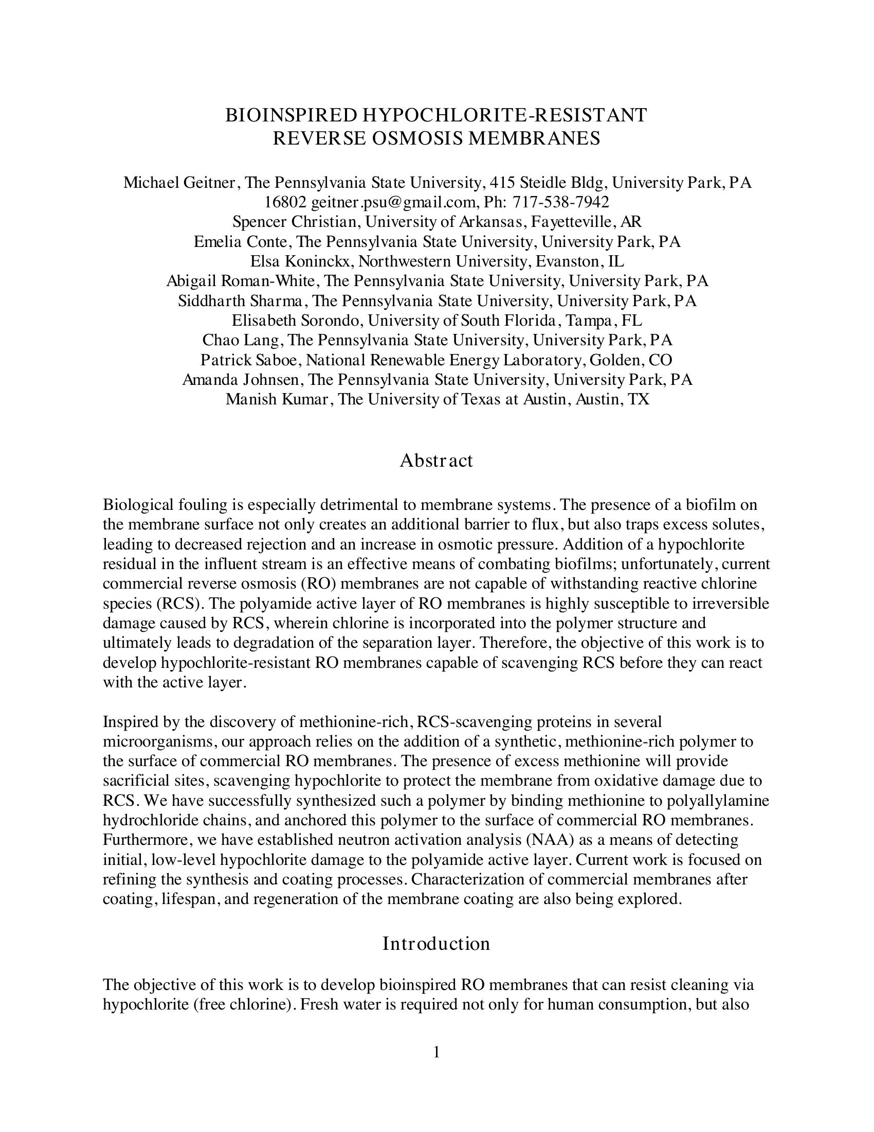 KeywordsHypochlorite-Resistance, Reverse Osmosis, Bioinspired