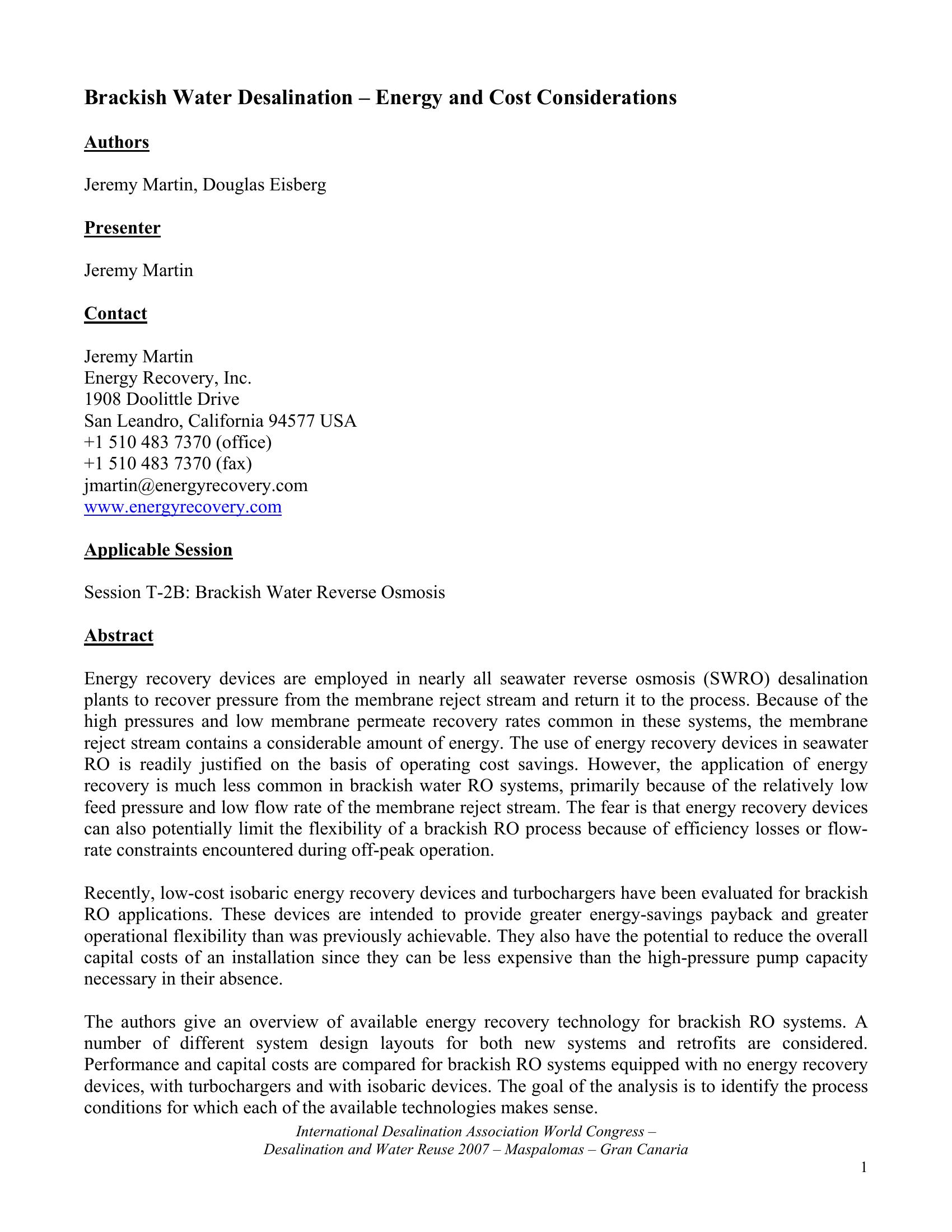 | Keywords | Energy Recovery Device, Seawater Reverse Osmosis, brackish |
