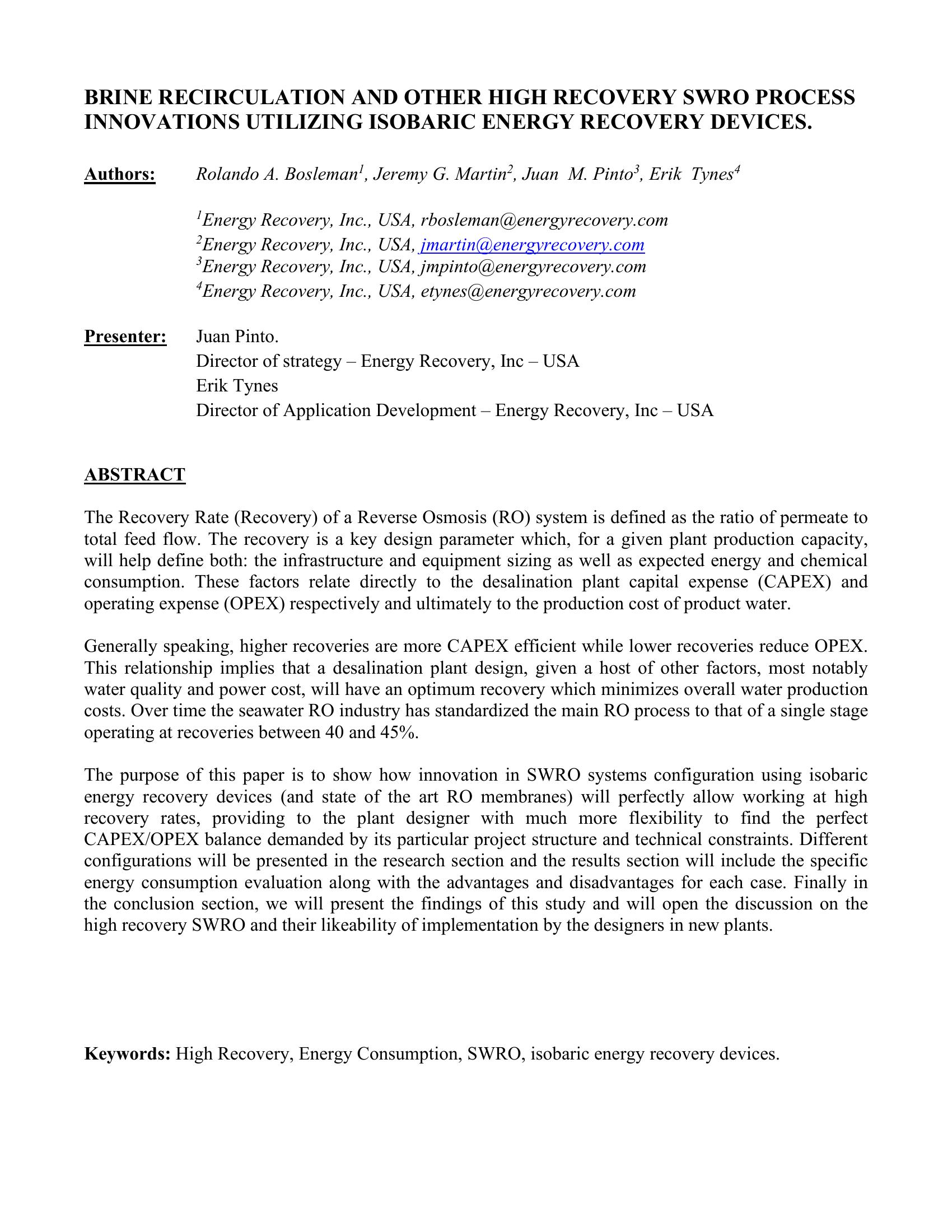 | Keywords | High Recovery, Energy Consumption, SWRO, Isobaric Engery Recovery Devices |