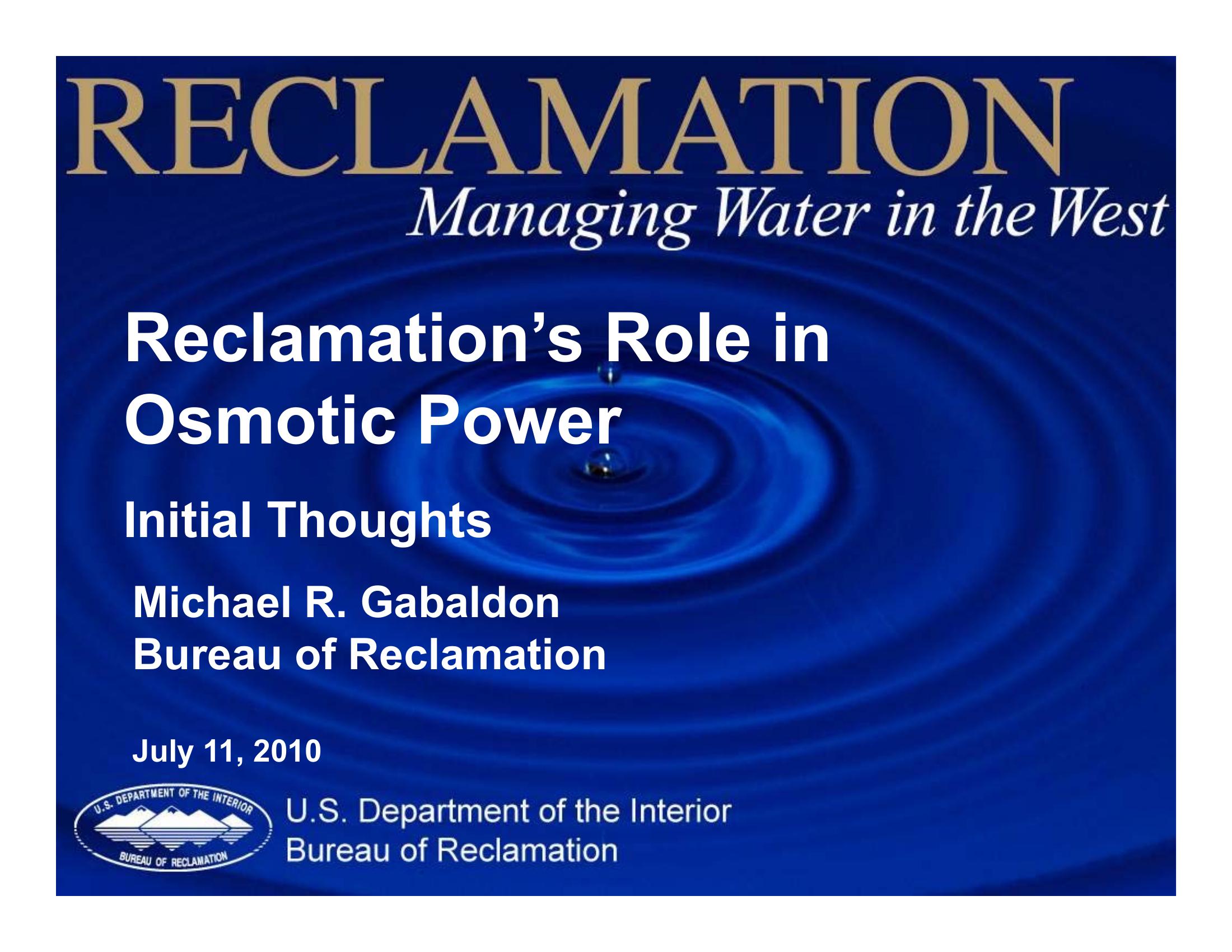 This is a general overview of the role that the Bureau of Reclamation has played in developing water sources in the American West. As the second largest hydroelectirc power producer in the US, the Bureau works with the Army, DOE and DOI to develop green renewable energy sources including solar, wind, and hydro. They will be tracking developments in forward osmosis and pressure retarded osmosis.