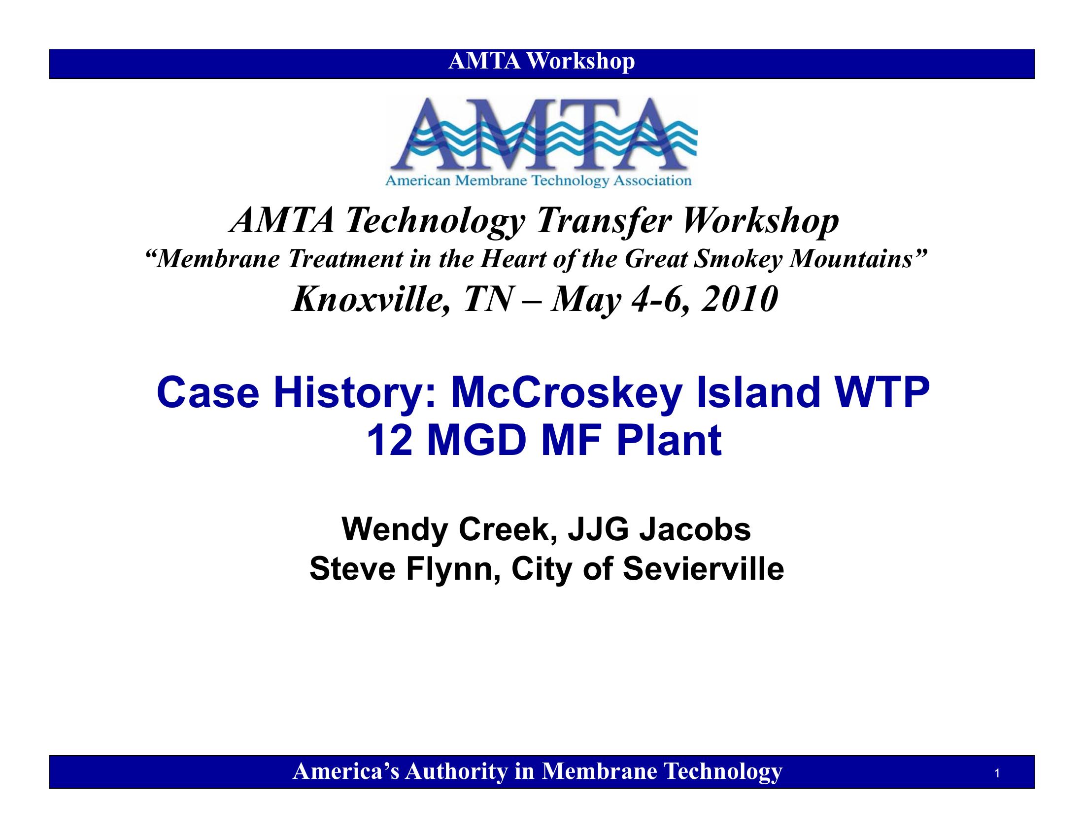 This powerpoint presents a case history of the McCroskey Island Water Treatment Plant, a 12 mgd microfiltration plant located in Sevierville, Tennesee.