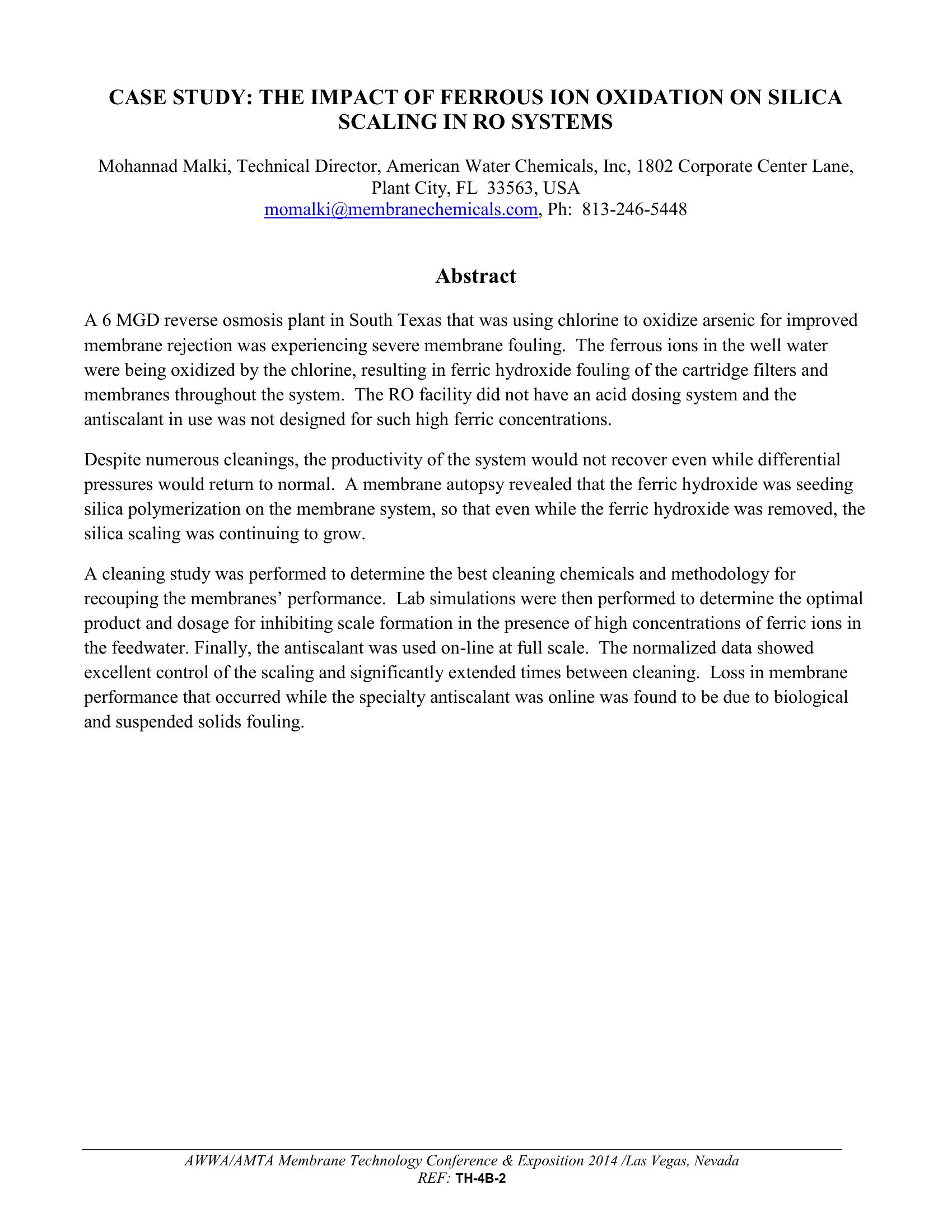 A 6 MGD reverse osmosis plant in South Texas that was using chlorine to oxidize arsenic for improved membrane rejection was experiencing severe membrane fouling. The ferrous ions in the well water were being oxidized by the chlorine, resulting in ferric hydroxide fouling of the cartridge filters and membranes throughout the system. Despite numerous cleanings, the productivity of the system would not recover even while differential pressures would return to normal. A membrane autopsy revealed that the ferric hydroxide was seeding silica polymerization on the membrane system, so that even while the ferric hydroxide was removed, the silica scaling was continuing to grow. A description of the chemistry behind the scale formation and cleaning methods to impede the scale formation are discussed.