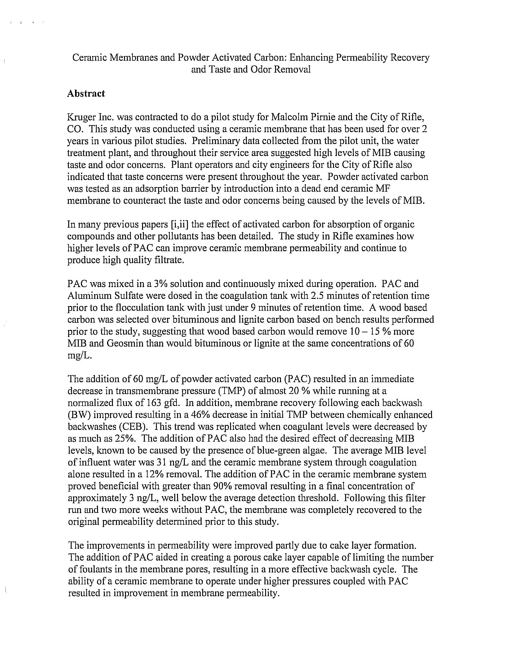 Ceramic membranes combines with PAC can be an effective method at removing TOC; this reducing DBPs and controlling taste and odor issues. A pilot using a ceramic membrane included pretreatment with PAC and coagulant. The pretreatment resulted in a TOC removal of up to 80%.