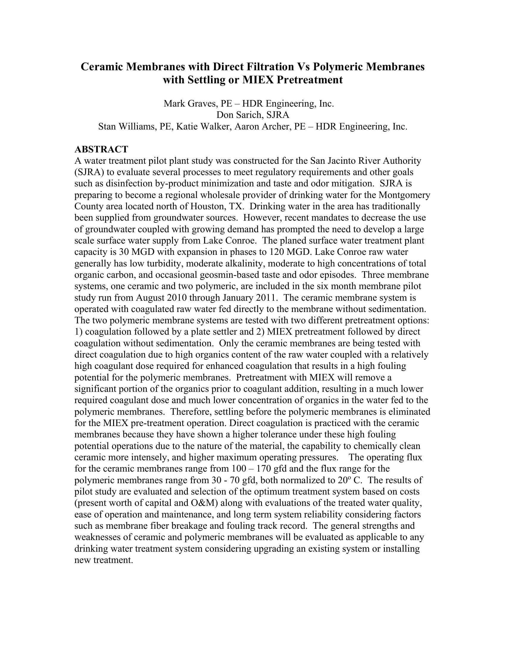 The results of pilot study for the San Jacinto River Authority are evaluated. Selection of the optimum treatment system was based on costs along with evaluations of the treated water quality, ease of operation and maintenance, and long term system reliability. The general strengths and weaknesses of ceramic and polymeric membranes are evaluated as applicable to any drinking water treatment system considering upgrading an existing system or installing new treatment.