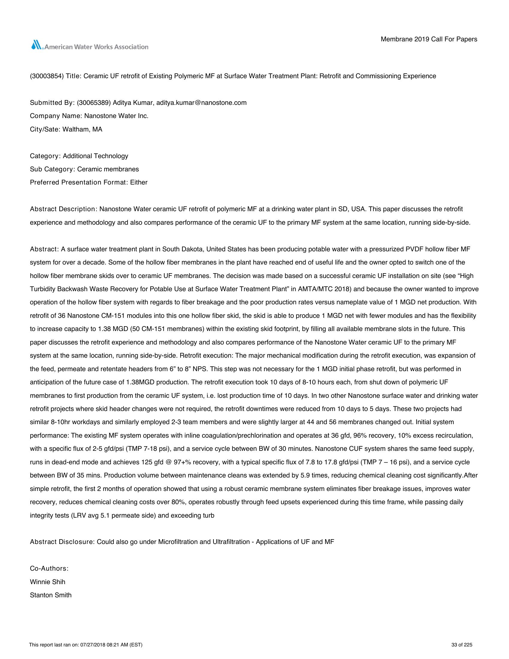 | Keywords | Ultrafiltration, Ceramic, Retrofit |