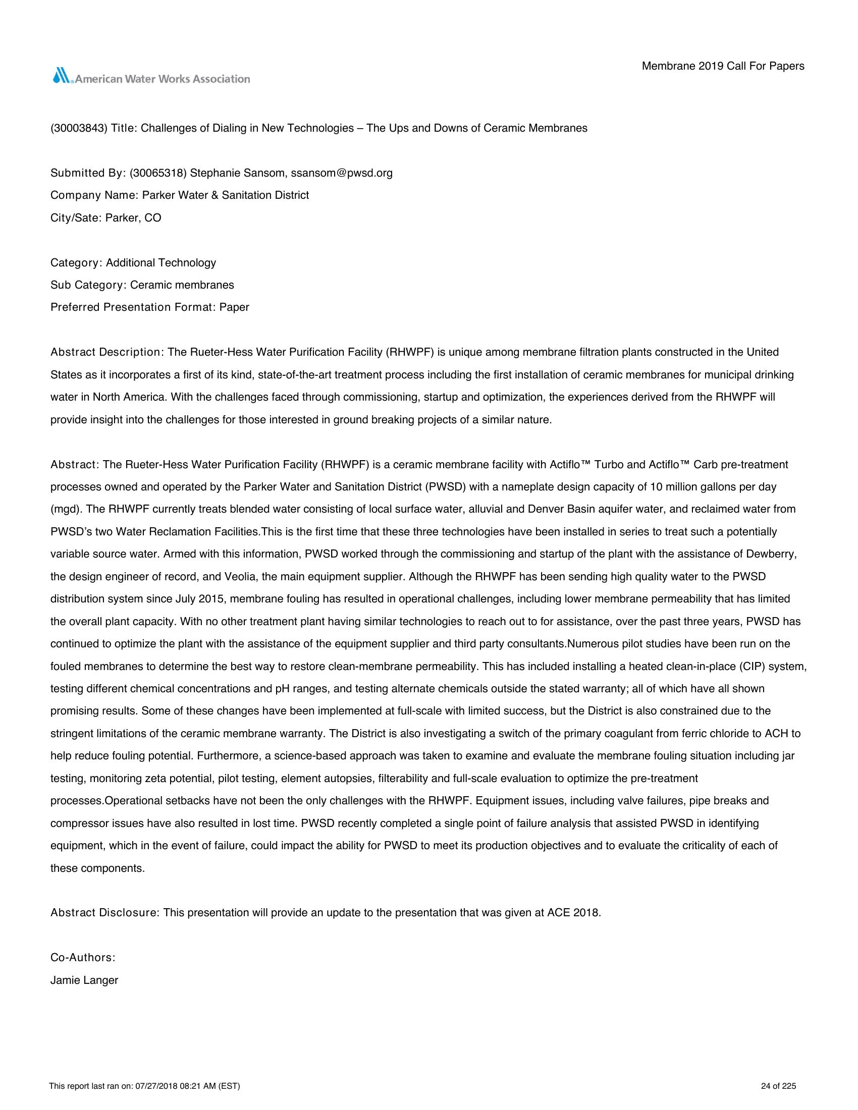The Rueter-Hess Water Purification Facility (RHWPF) is unique among membrane filtration plants constructed in the United States as it incorporates a first of its kind, state-of-the-art treatment process including the first installation of ceramic membranes for municipal drinking water in North America. With the challenges faced through commissioning, startup and optimization, the experiences derived from the RHWPF will provide insight into the challenges for those interested in ground breaking projects of a similar nature.