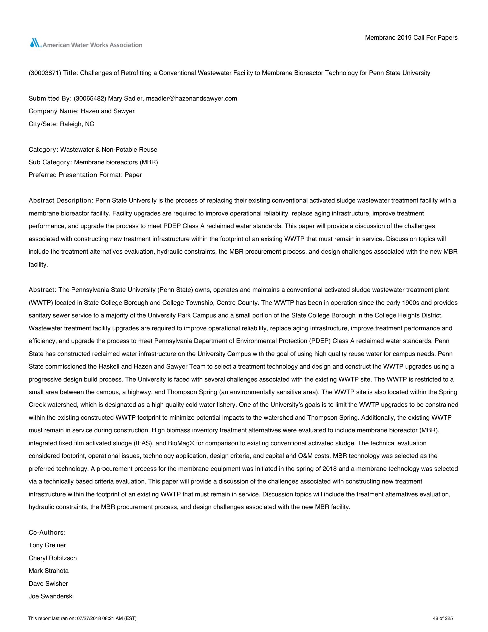 Challenges of Retrofitting a Conventional Wastewater Facility to Membrane Bioreactor Technology for Penn State University