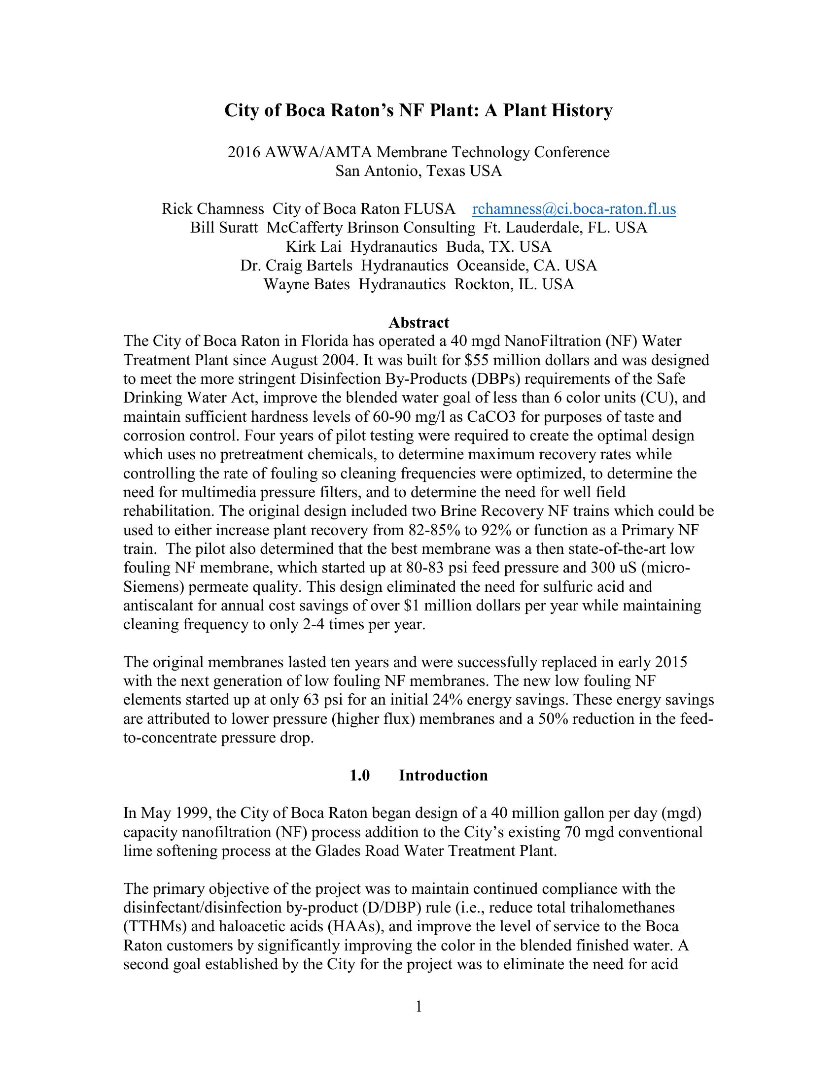 This paper gives a history of the 40 MGD NanoFiltration (NF) Water Treatment facility at the City of Boca Raton, Florida that has operated since August 2004. . The original membranes lasted ten years and were replaced with the next generation of low fouling NF membranes. The new low fouling NF elements started up at only 63 psi for an initial 24% energy savings. The initial design based on pilot testing eliminated the need for pretreatment chemicals for annual cost savings.