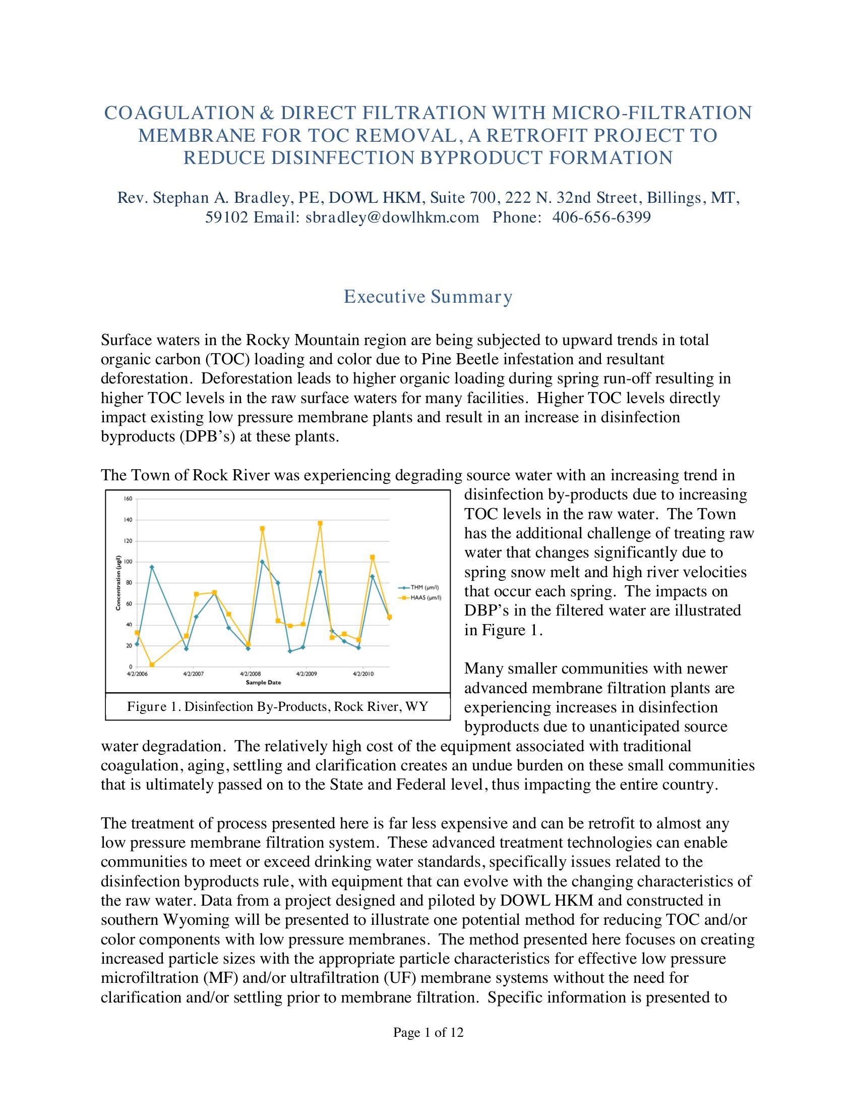 This presentation addresses pretreatment methods in combination with low pressure hollow fiber membranes in the micro-filtration and ultra-filtration range when utilized to treat surface waters. The presentation does not focus on any specific membrane manufacturer, but shows that several manufacturers have products that will provide an effective TOC reduction when used in combination with a coagulation method targeted to their specific membrane and the constituents that are to be removed. The presentation also shows that relatively low cost retrofits to existing facilities can provide a significant improvement in TOC reduction and thus a significant reduction in disinfection byproducts.