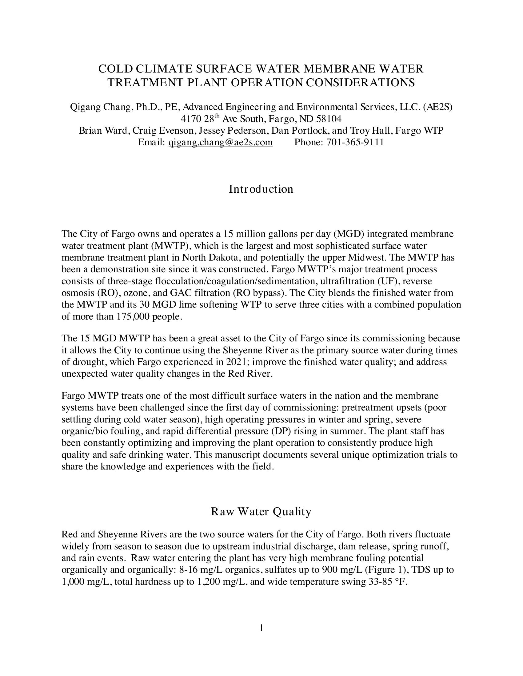 The City of Fargo owns and operates a 15 million gallons per day (MGD) integrated membrane water treatment plant (MWTP), which is the largest and most sophisticated surface water membrane treatment plant in North Dakota, and potentially the upper Midwest. The MWTP has been a demonstration site since it was constructed. Fargo MWTPís major treatment process consists of three-stage flocculation/coagulation/sedimentation, ultrafiltration (UF), reverse osmosis (RO), ozone, and GAC filtration (RO bypass). The City blends the finished water from the MWTP and its 30 MGD lime softening WTP to serve three cities with a combined population of more than 175,000 people. The 15 MGD MWTP has been a great asset to the City of Fargo since its commissioning because it allows the City to continue using the Sheyenne River as the primary source water during times of drought, which Fargo experienced in 2021; improve the finished water quality; and address unexpected water quality changes in the Red River. Fargo MWTP treats one of the most difficult surface waters in the nation and the membrane systems have been challenged since the first day of commissioning: pretreatment upsets (poor settling during cold water season), high operating pressures in winter and spring, severe organic/bio fouling, and rapid differential pressure (DP) rising in summer. The plant staff has been constantly optimizing and improving the plant operation to consistently produce high quality and safe drinking water. This manuscript documents several unique optimization trials to share the knowledge and experiences with the field.