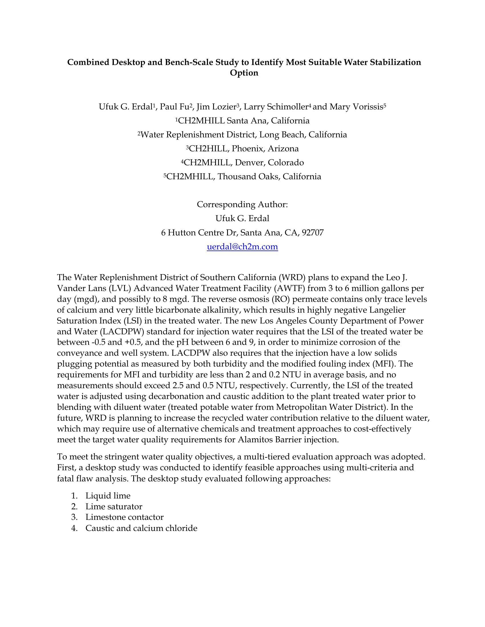 Combined Desktop and Bench-Scale Study to Identify Most Suitable Water Stabilization Option