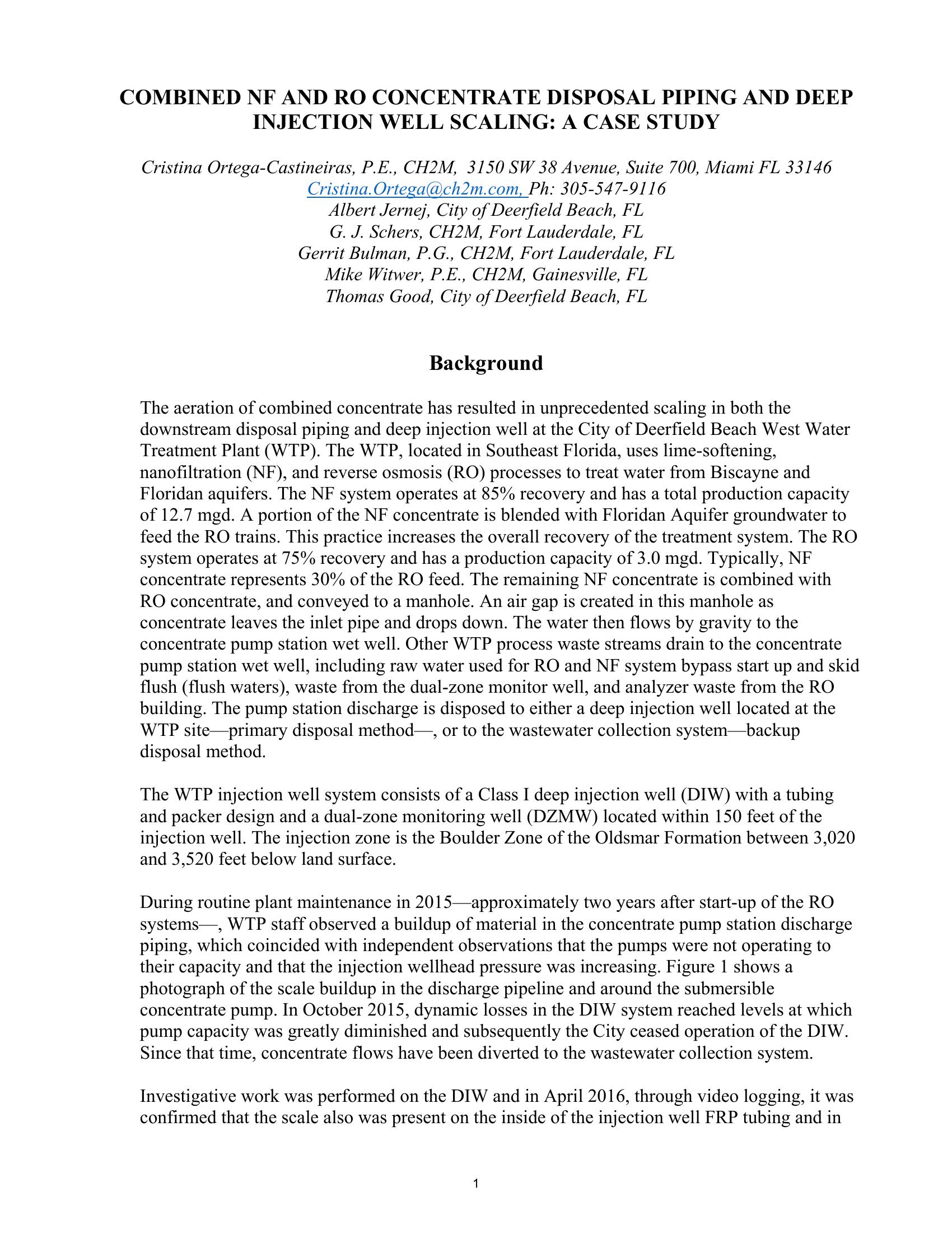 The aeration of combined NF and RO concentrate has resulted in unprecedented scaling in both the downstream disposal piping and deep injection well at the City of Deerfield Beach West Water Treatment Plant. Investigation results indicated that iron (31 to 56%), phosphorus (18 to 23%), calcium (12 to 24%), and sulfur (2 to 11%) make up the main components of the scale deposits found in the concentrate disposal system. Further growth in potable water demands will drive the industry to increased membrane system recoveries. Systems with increased recovery have been operating successfully on groundwater in Florida; however, this case study from Deerfield Beach highlights significant scaling potential from a combined concentrate after aeration– a precautionary example, which will be shared with industry peers.