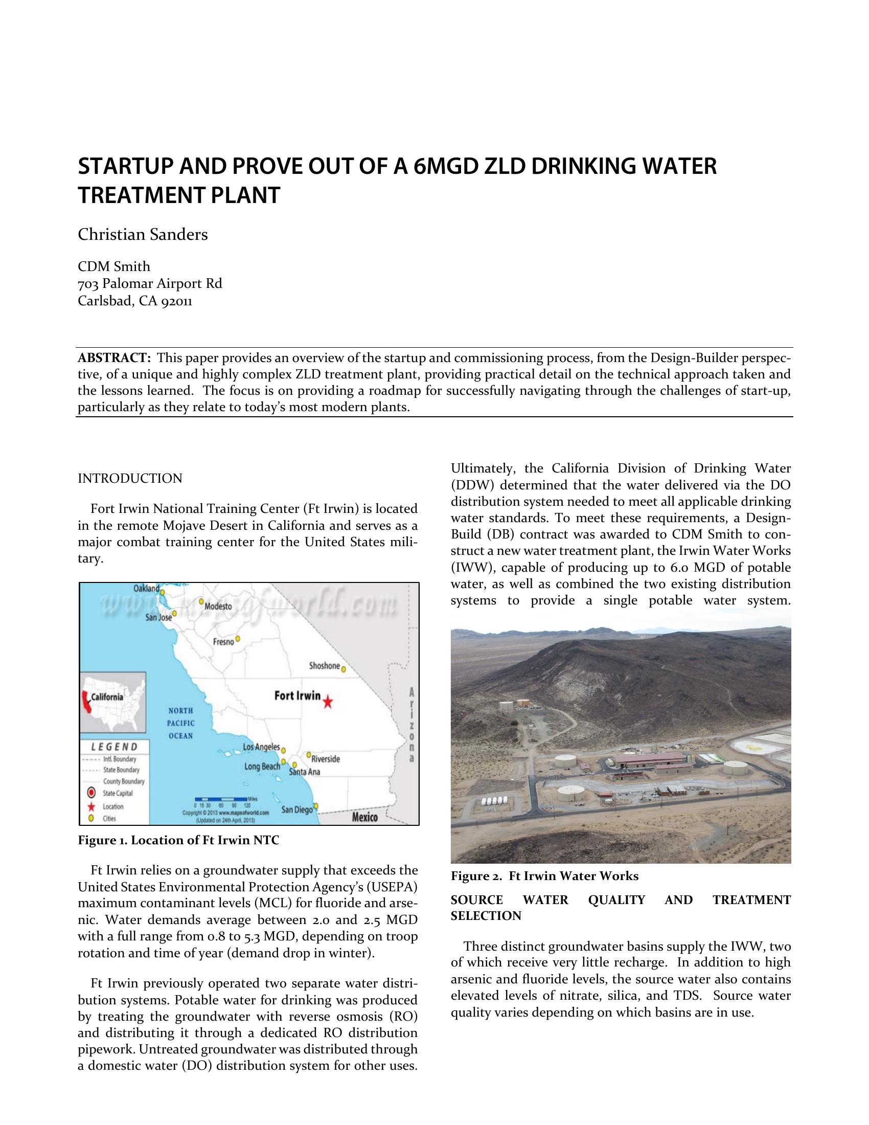 This presentation provides an overview of the commissioning and performance proving of a highly complex 6 MGD water treatment plant designed, built, and commissioned by CDM Smith. Located in the USA?s Mojave Desert, the treatment processes include three different membrane treatment systems (EDR, UF, and RO) in addition to lime softening, ion exchange, and mechanical evaporation to achieve a ZLD goal of greater than 99% water recovery.