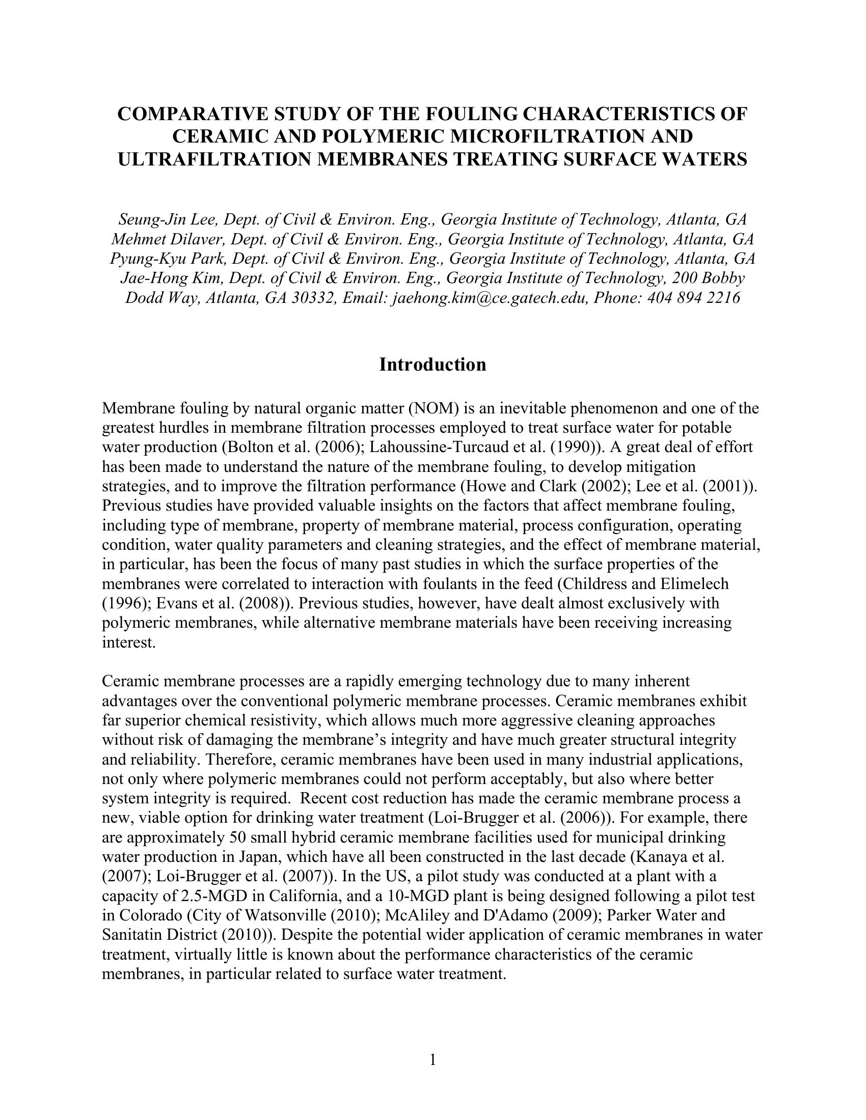 Membrane fouling by natural organic matter (NOM) is an inevitable phenomenon and one of the greatest hurdles in membrane filtration processes employed to treat surface water for potable water production (Bolton et al. (2006); Lahoussine-Turcaud et al. (1990)). A great deal of effort has been made to understand the nature of the membrane fouling, to develop mitigation strategies, and to improve the filtration performance (Howe and Clark (2002); Lee et al. (2001)). Previous studies have provided valuable insights on the factors that affect membrane fouling, including type of membrane, property of membrane material, process configuration, operating condition, water quality parameters and cleaning strategies, and the effect of membrane material, in particular, has been the focus of many past studies in which the surface properties of the membranes were correlated to interaction with foulants in the feed (Childress and Elimelech (1996); Evans et al. (2008)). Previous studies, however, have dealt almost exclusively with polymeric membranes, while alternative membrane materials have been receiving increasing interest.
