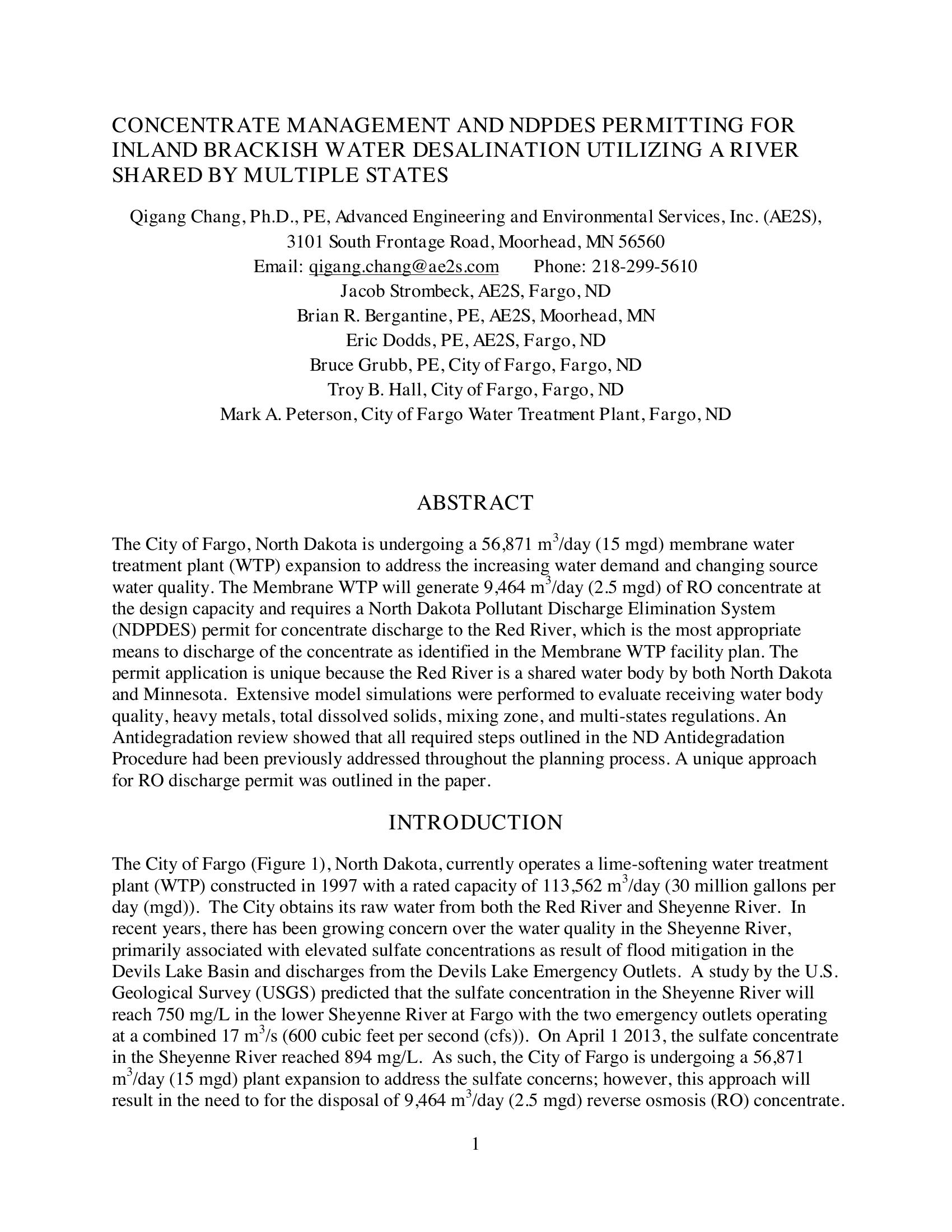 City of Fargo North Dakota has a surface water reverse osmosis system (RO) which requires brine concentrate discharge management back to a river that meets NPDES permit requirements. Contaminants of concerns are sulfates and heavy metals. Model simulations performed to determine proper mixing zone.
