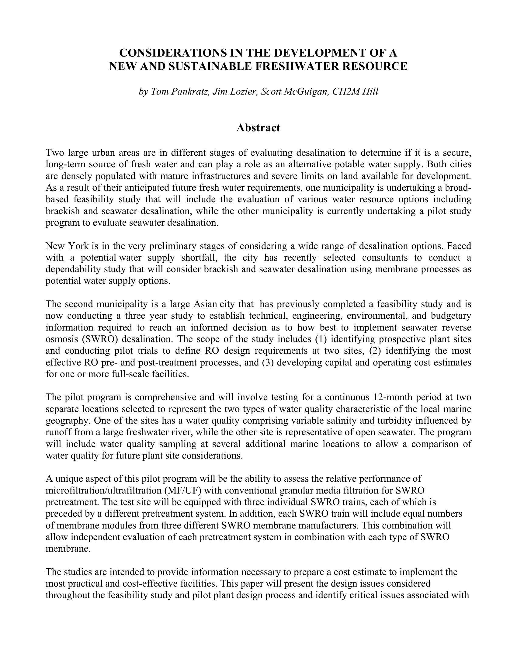 This paper will present the design issues considered throughout the feasibility study and pilot plant design process and identify critical issues associated with siting a desalination facility in land-limited areas. It will also describe the pilot test protocol, specific test objectives, and the design of pretreatment and SWRO systems expected to be used.