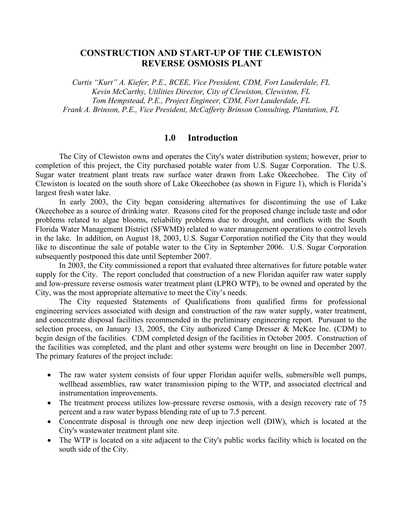 | Keywords | Clewiston, reverse osmosis plant, membrane facility construction, concentrate disposal |