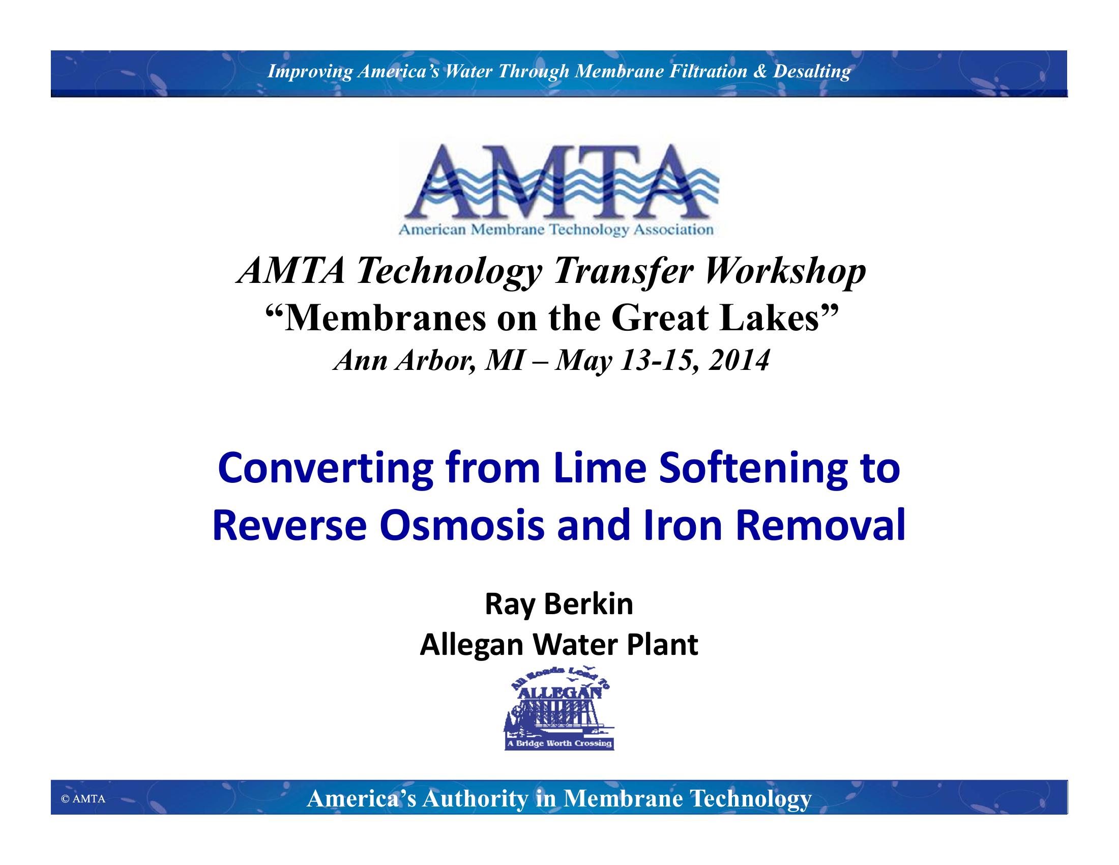 This presentation discusses the conversion of the City of Allegan Water Plant from a lime softening facility to a reverse osmosis (RO) facility for the treatment of groundwater. The presentation begins with a description of the alternatives evaluation, facility planning, and funding mechanisms for the water plant. Next the pretreatment and RO processes are presented along with select design criteria. The presentation concludes with a discussion of post-treatment processes.