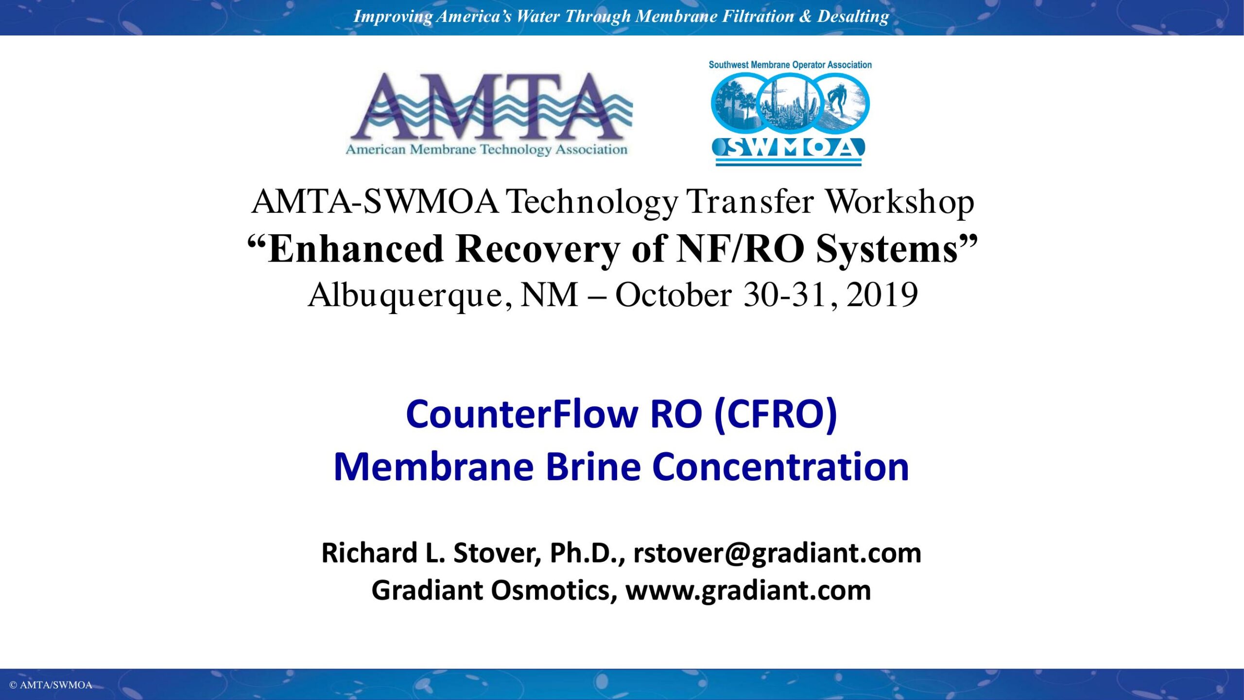 The Counterflow RO (CFRO) process is a membrane-based method for desalinating brines. It can achieve total dissolved solids (TDS) concentrations of up to 250,000 ppm with pressures of less than 1,000 psi or 70 bar and about half the energy required by mechanical vapor compression (MVC) evaporation. This technology has significance for multiple industrial sectors including mining, power, electronics, pharmaceuticals and food and beverage.