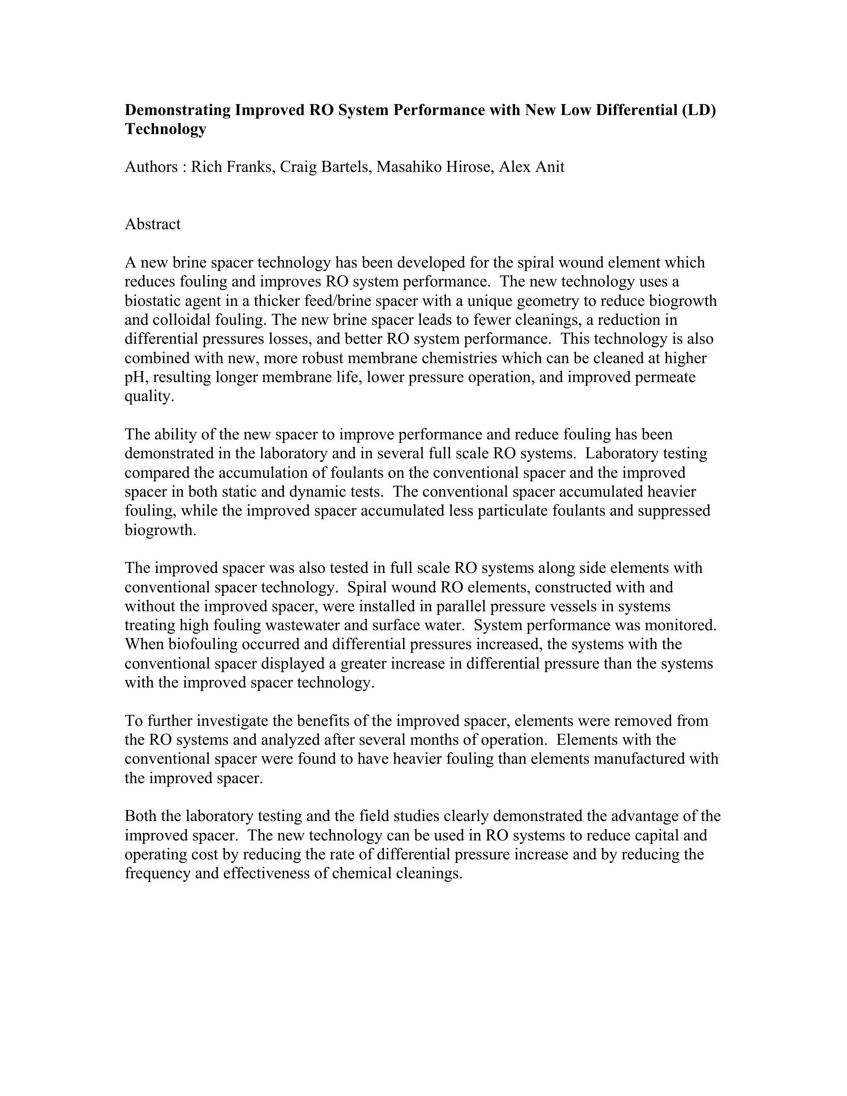 The performance of RO membranes wih a new thicker brine spacer that has biostatic agent is compared against conventional spacer technology. The unique geometry of the new spacer demonstrates improved performance in both lab and full scale systems.