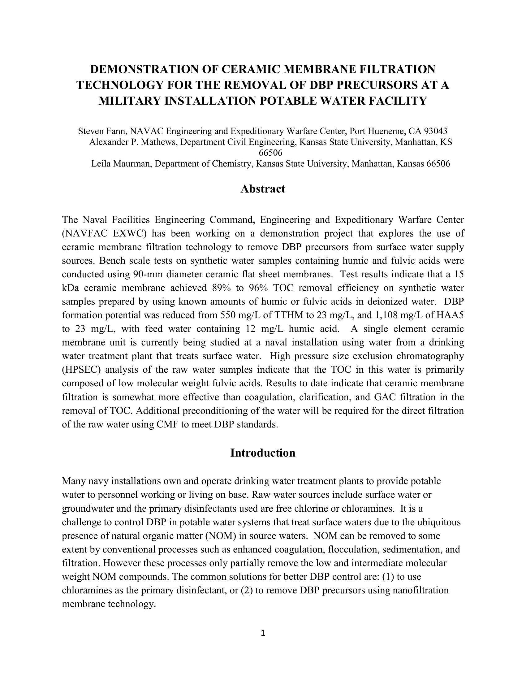 This paper is a case study of a demonstration project that explores the use of ceramic membrane filtration technology to remove DBP precursors from surface water at the Naval Facilities Command (NAVFAC) Engineering Service Center. The systems primary goal was to remove TOC cost-effectively to control DBP concentrations in the water distribution system in compliance with the emerging Stage II DBP Rule. Discussed are bench scale tests on synthetic water samples using 90-mm diameter ceramic flat sheet membranes and a single element ceramic membrane unit that is currently being studied at a naval installation using water from a drinking water treatment plant that treats surface water.