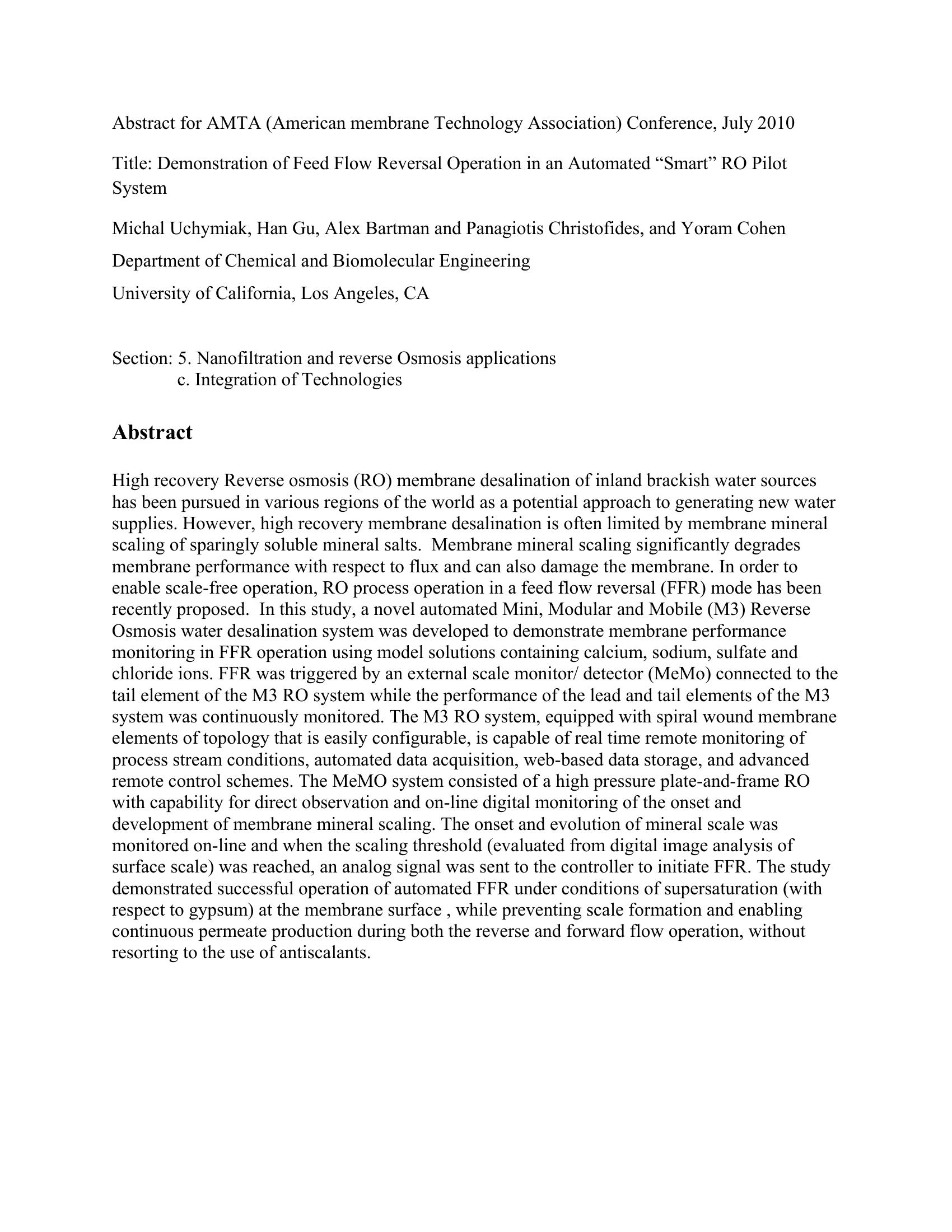 High recovery Reverse osmosis (RO) membrane desalination of inland brackish water sources has been pursued in various regions of the world as a potential approach to generating new water supplies. However, high recovery membrane desalination is often limited by membrane mineral scaling of sparingly soluble mineral salts. Membrane mineral scaling significantly degrades membrane performance with respect to flux and can also damage the membrane. In order to enable scale-free operation, RO process operation in a feed flow reversal (FFR) mode has been recently proposed. In this study, a novel automated Mini, Modular and Mobile (M3) Reverse Osmosis water desalination system was developed to demonstrate membrane performance monitoring in FFR operation using model solutions containing calcium, sodium, sulfate and chloride ions. FFR was triggered by an external scale monitor/ detector (MeMo) connected to the tail element of the M3 RO system while the performance of the lead and tail elements of the M3 system was continuously monitored. The multi-cycle experiments were conducted using a model solution of salinity 2,529 mg/L total dissolved solids, prepared using CaCl2, NaCl, and Na2SO4 mineral salts to yield a feed solution with gypsum (CaSO4?2H2O) saturation index of 0.52. The M3 RO pilot system was utilized to study the operation of the FFR strategy demonstrating effective operation over multiple cycles. Especially since variation of FFR cycles were encountered given the randomness of crystal nucleation on the membrane surface. Accordingly, it is evident that practical application of FFR for mitigating mineral scaling would require both a sensitive scale detection method (such as the MEMO system presented here), as well as automatic feedback control.
