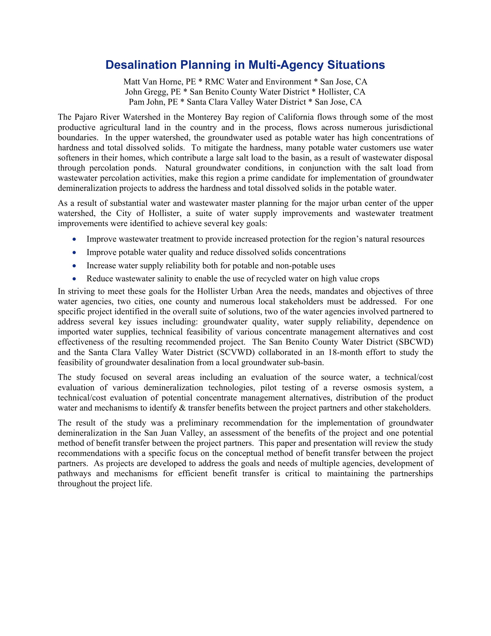 The Pajaro River Watershed in the Monterey Bay region of California flows through some of the most productive agricultural land in the country and in the process, flows across numerous jurisdictional boundaries. In the upper watershed, the groundwater used as potable water has high concentrations of hardness and total dissolved solids. To mitigate the hardness, many potable water customers use water softeners in their homes, which contribute a large salt load to the basin, as a result of wastewater disposal through percolation ponds. Natural groundwater conditions, in conjunction with the salt load from wastewater percolation activities, make this region a prime candidate for implementation of groundwater demineralization projects to address the hardness and total dissolved solids in the potable water.