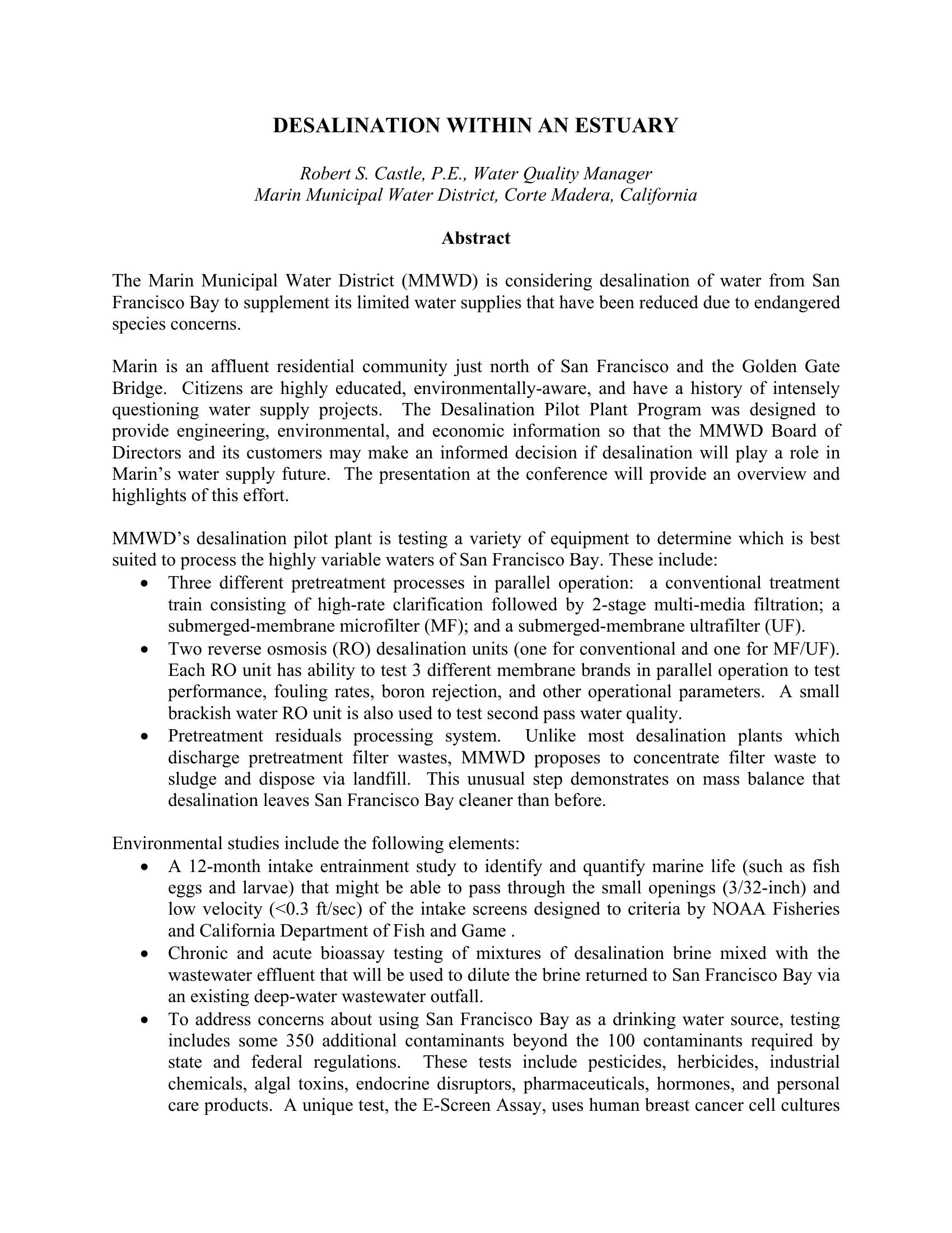 Study to evaluate SW desal in Marin County, CA. Study to determine best options for highly variable feed of San Francisco Bay. Environmental studies also being conducted both on intake and concentrate.