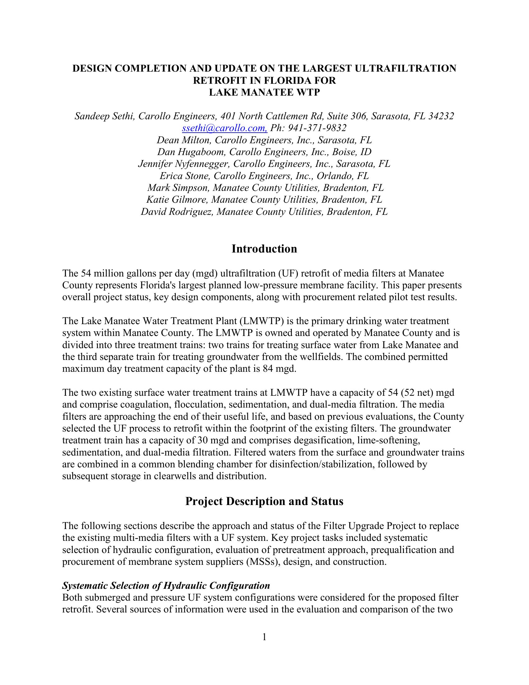 Design Completion and Update on the Largest Ultrafiltration Retrofit in Florida for Lake Manatee WTP