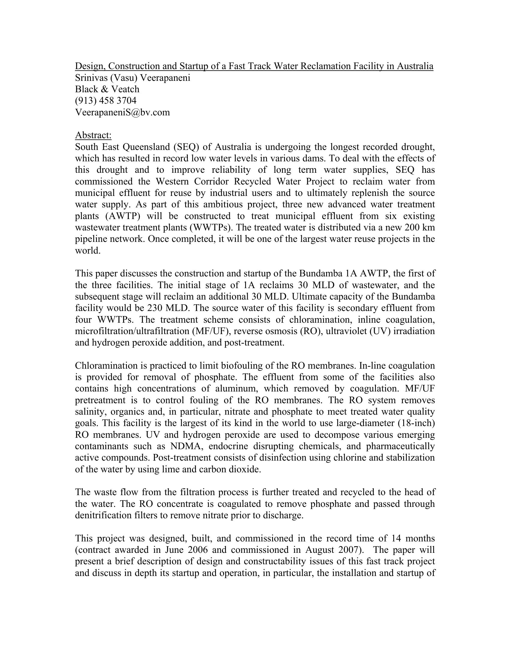 This paper describes the Design, Construction & Startup of a Fast Track Water Reclamation Facility. This project was designed, built, and commissioned in the record time of 14 months (contract awarded in June 2006 and commissioned in August 2007). The paper presents a brief description of design and constructability issues of this fast track project and discuss’ in depth its startup and operation, in particular, the installation and startup of microfiltration. This project was on the fast track due to the longest recorded drought in Australia.