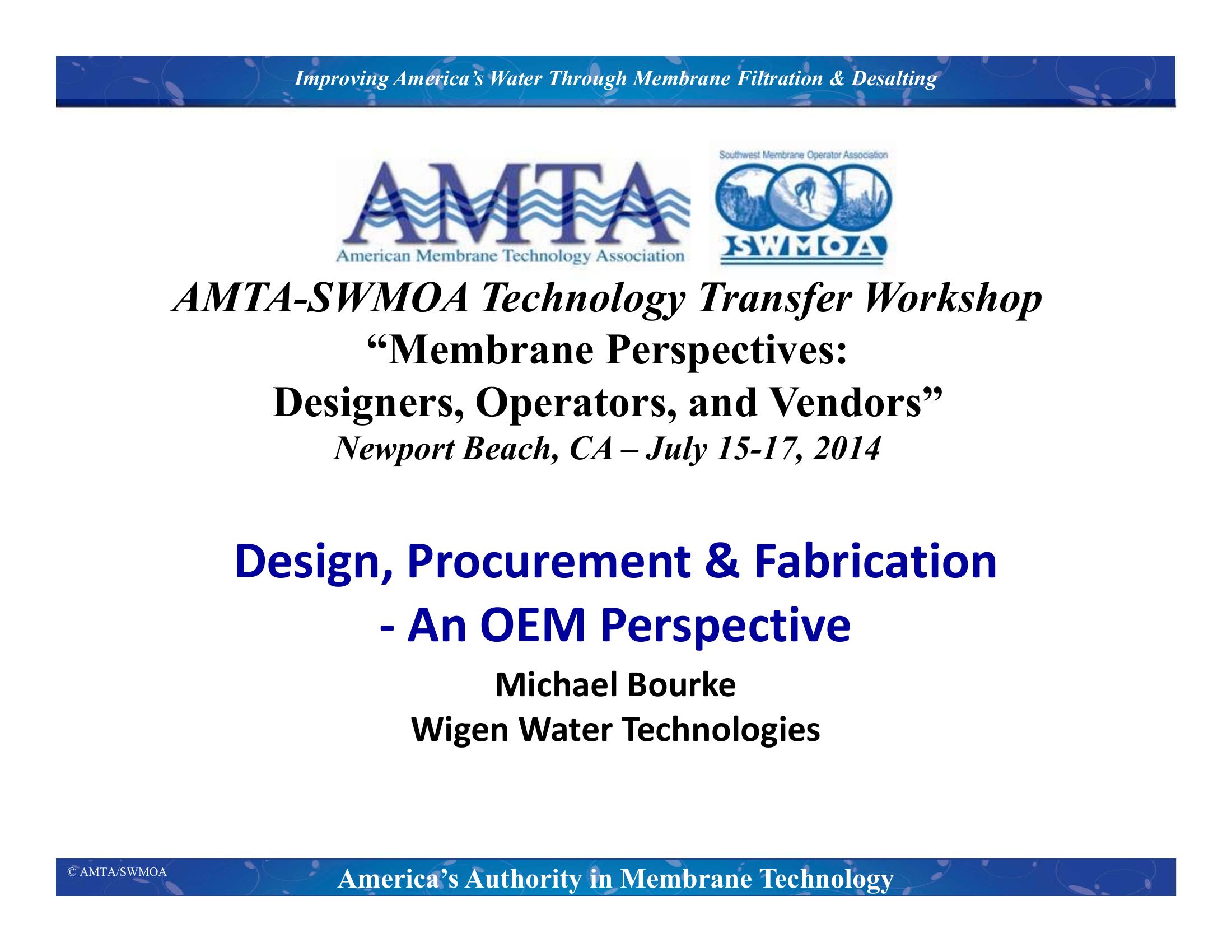 This presentation documents membrane system design, procurement, and fabrication considerations for projects that use an original equipment manufacturer (OEM). Topics discussed include specification review, project budgeting, procurement approach, bidding schedule, and fabrication schedule. The presentation concludes with two case studies that provide suggestions for improving the contractor bid method of procurement.